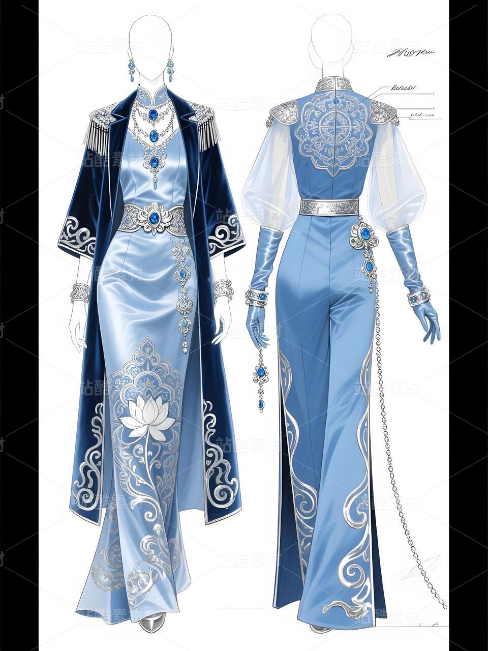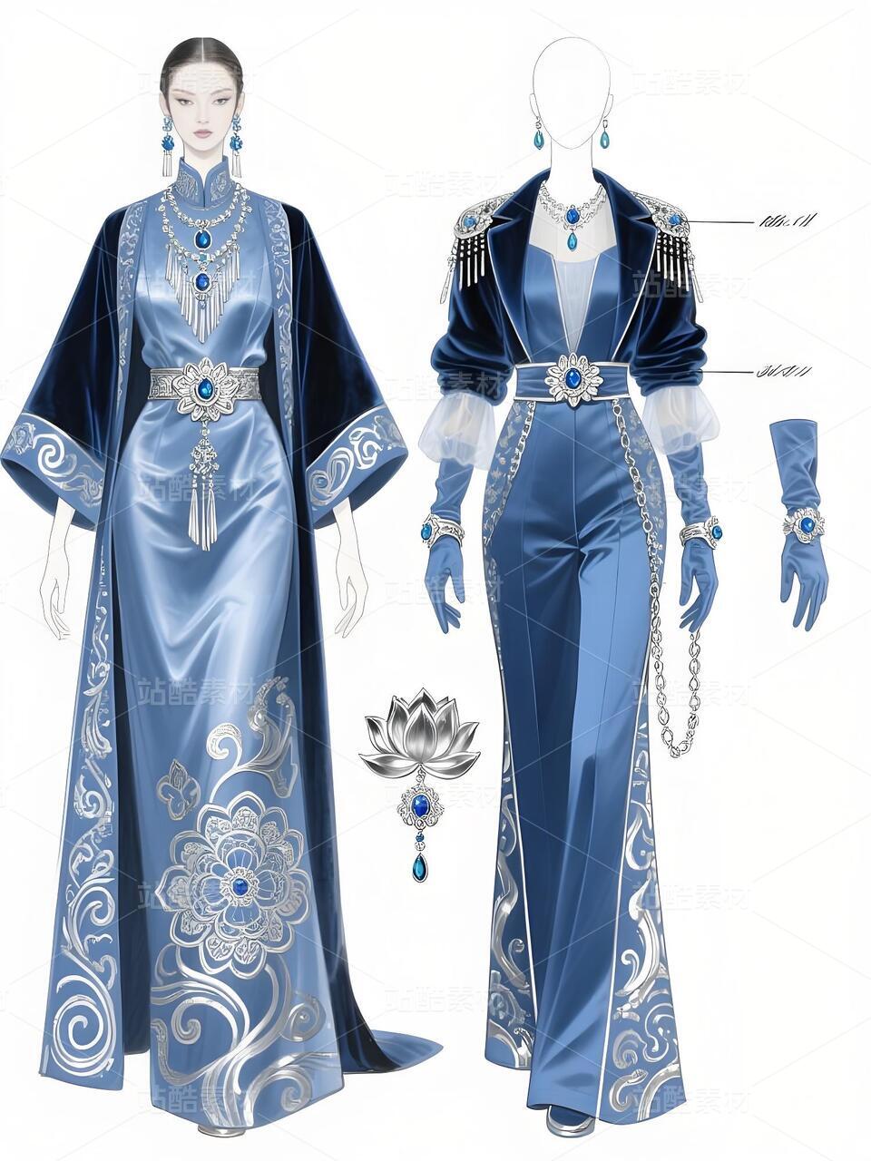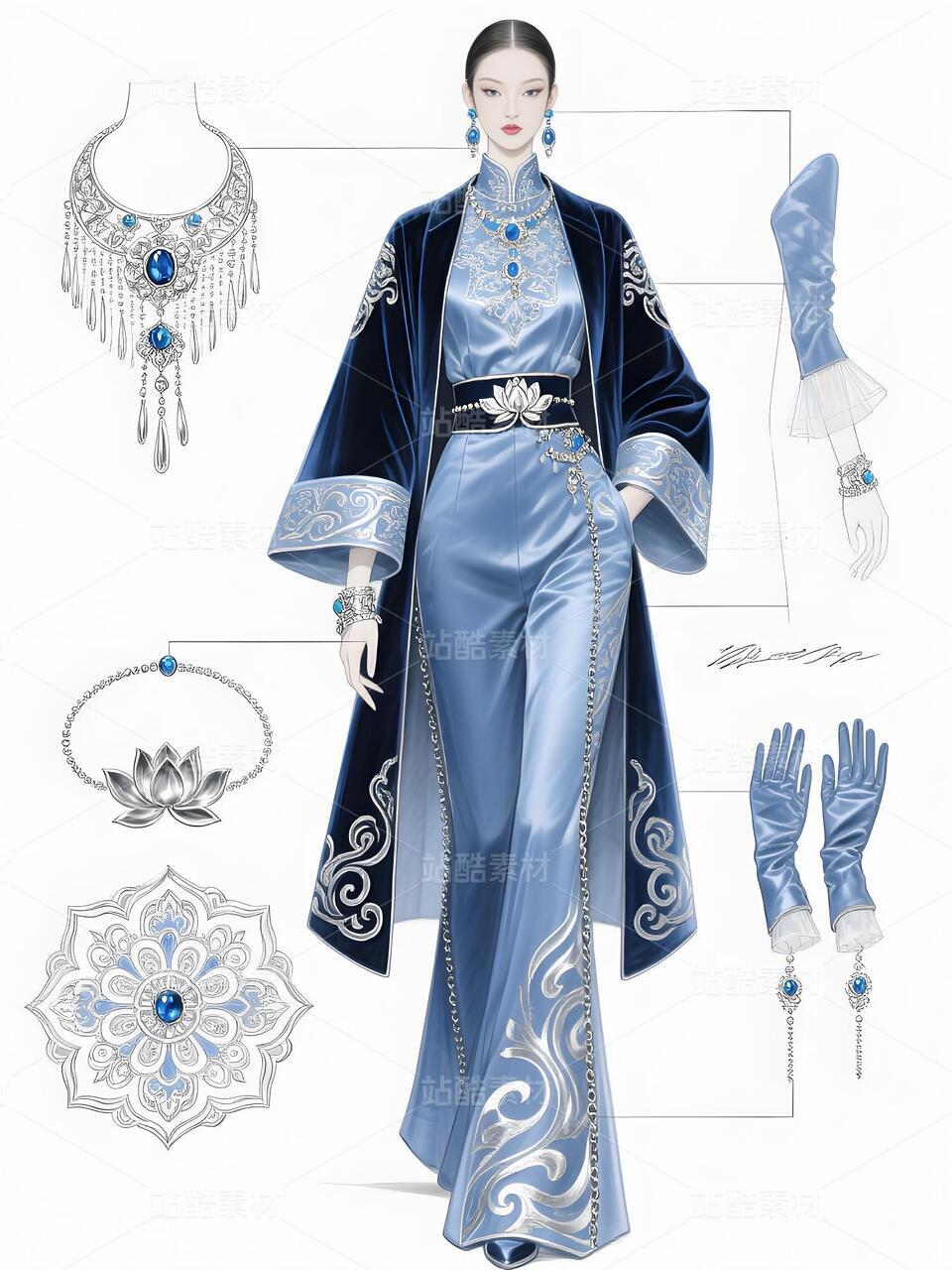 本系列以敦煌藻井璎珞纹为灵感,采用银蓝色系演绎冰封千年的敦煌美学。设计师通过数码提花技术将藻井几何纹样转化为冰裂纹理,在礼服上呈现晶莹剔透的视觉效果。外套运用金属感针织工艺再现璎珞层叠结构,裤装侧缝镶嵌激光雕刻的藻井纹透明薄纱。配饰采用3D打印技术打造冰晶状璎珞装置,手套结合冷光纤维与银线刺绣,在行走间折射出冰川般的光泽变化。整套设计通过现代科技工艺与传统纹样的对话,打造出既具未来感又不失东方韵味的冰雪敦煌系列。