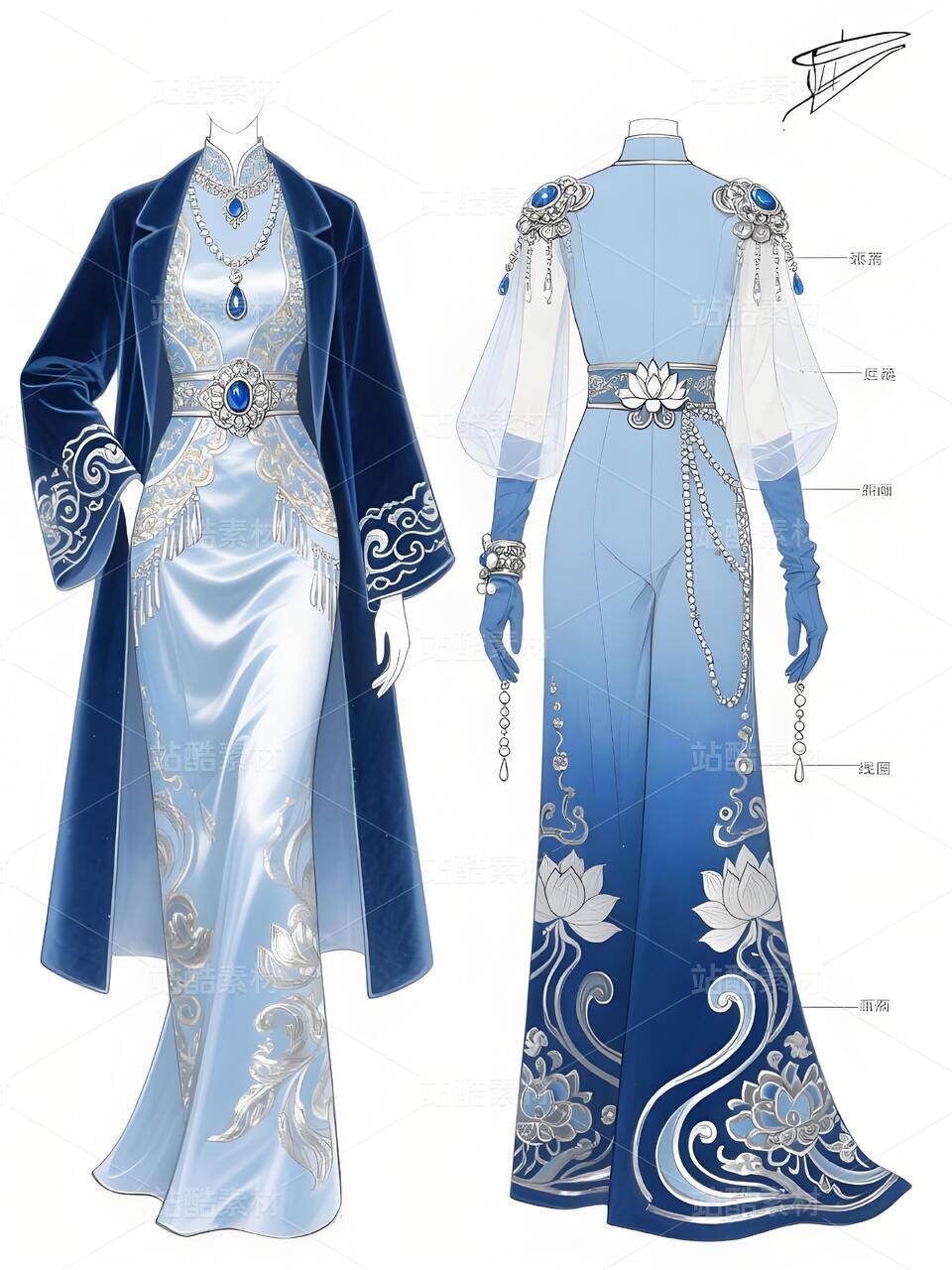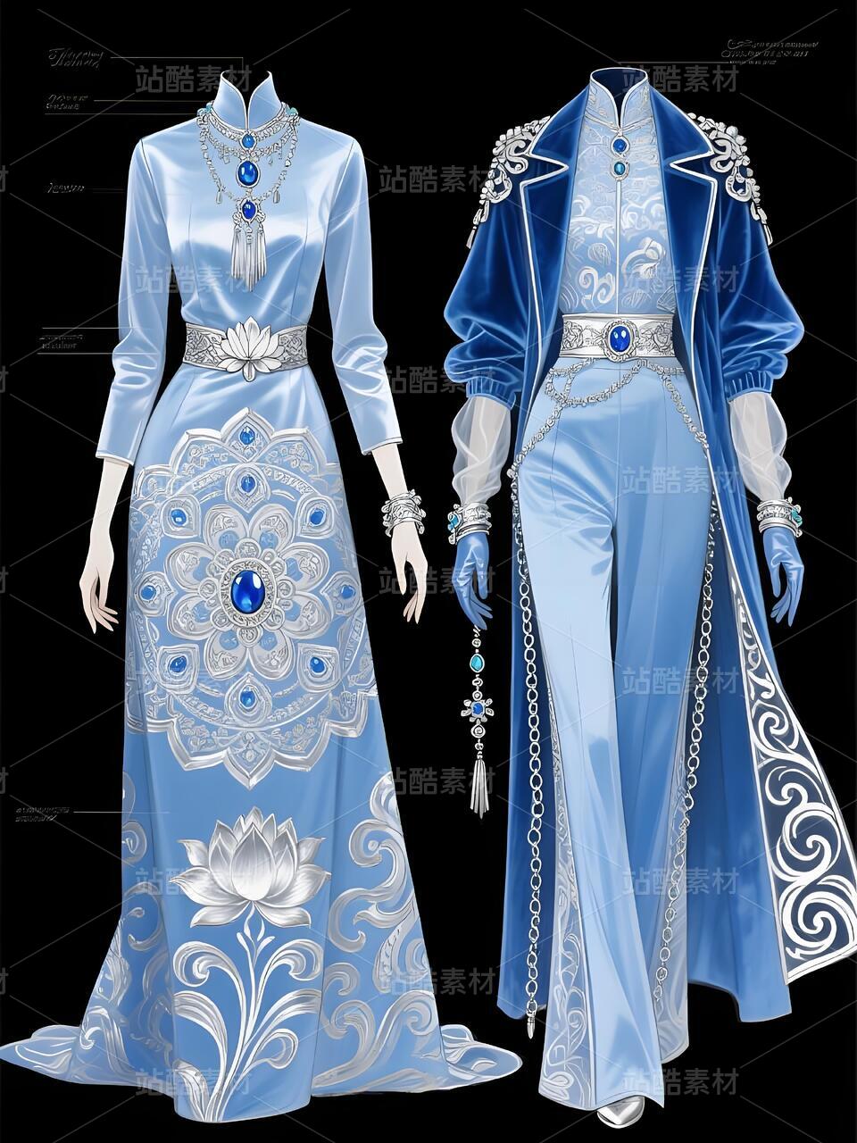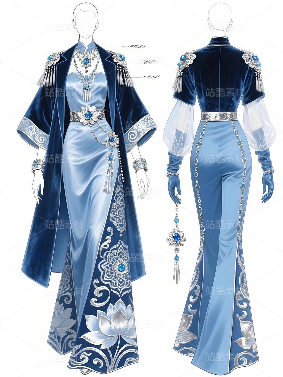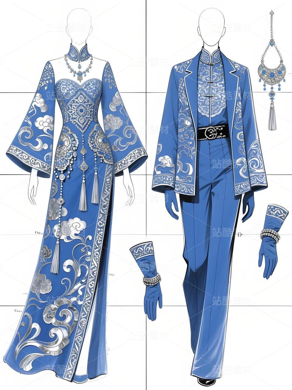 本系列以敦煌藻井璎珞纹为灵感,采用银蓝色系演绎冰封千年的敦煌美学。设计师通过数码提花技术将藻井几何纹样转化为冰裂纹理,在礼服上呈现晶莹剔透的视觉效果。外套运用金属感针织工艺再现璎珞层叠结构,裤装侧缝镶嵌激光雕刻的藻井纹透明薄纱。配饰采用3D打印技术打造冰晶状璎珞装置,手套结合冷光纤维与银线刺绣,在行走间折射出冰川般的光泽变化。整套设计通过现代科技工艺与传统纹样的对话,打造出既具未来感又不失东方韵味的冰雪敦煌系列。