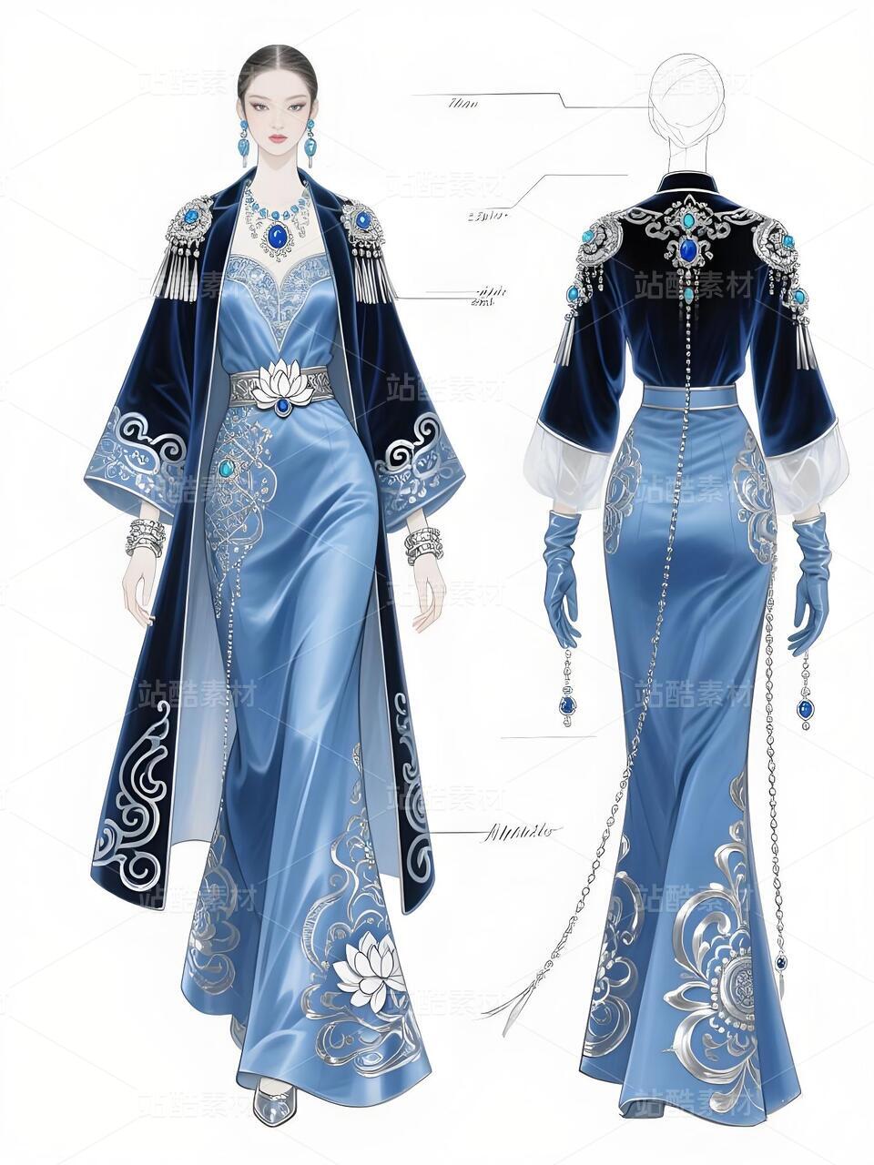本系列以敦煌藻井璎珞纹为灵感,采用银蓝色系演绎冰封千年的敦煌美学。设计师通过数码提花技术将藻井几何纹样转化为冰裂纹理,在礼服上呈现晶莹剔透的视觉效果。外套运用金属感针织工艺再现璎珞层叠结构,裤装侧缝镶嵌激光雕刻的藻井纹透明薄纱。配饰采用3D打印技术打造冰晶状璎珞装置,手套结合冷光纤维与银线刺绣,在行走间折射出冰川般的光泽变化。整套设计通过现代科技工艺与传统纹样的对话,打造出既具未来感又不失东方韵味的冰雪敦煌系列。