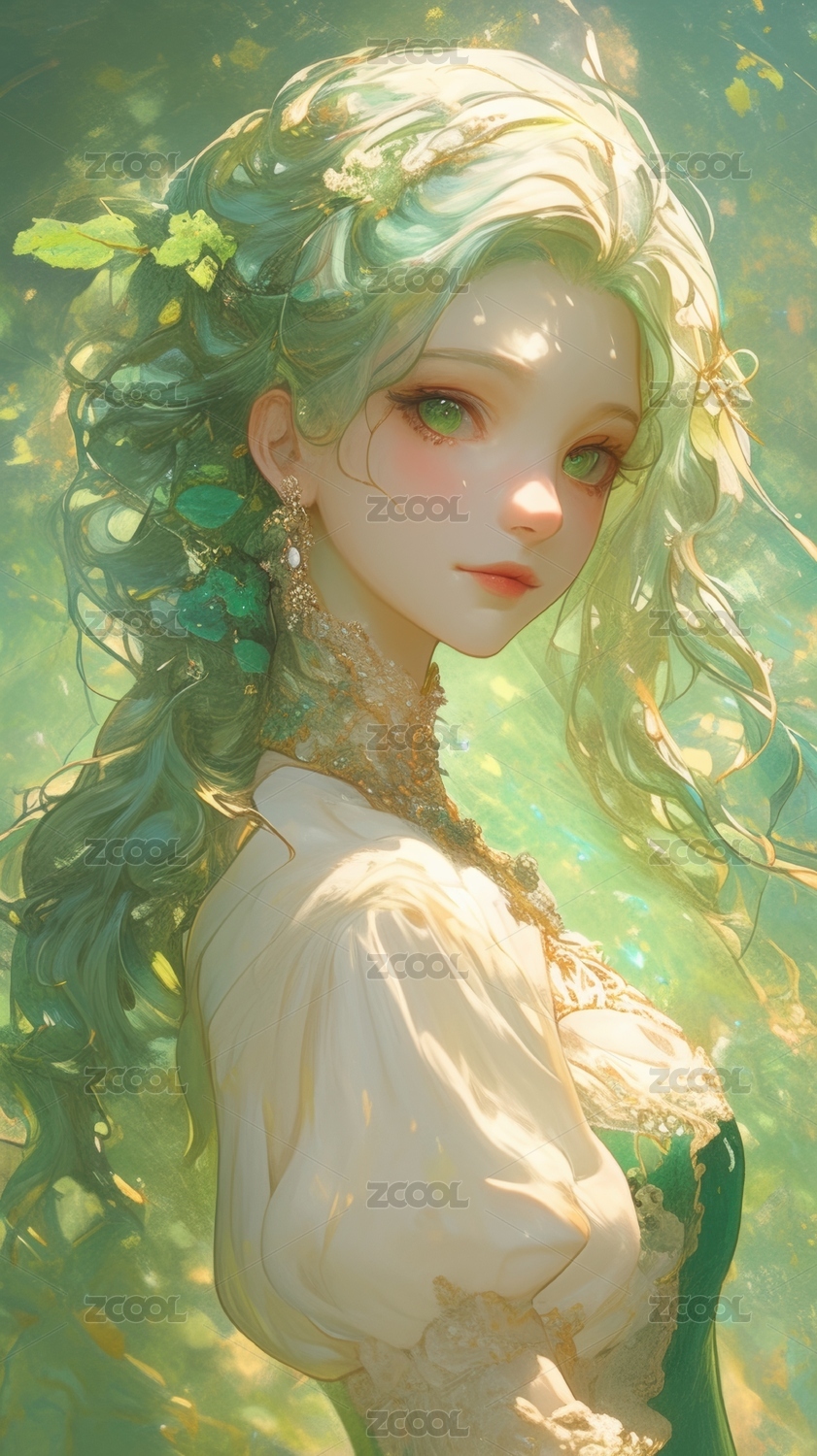 绿发精灵少女的梦幻姿态
