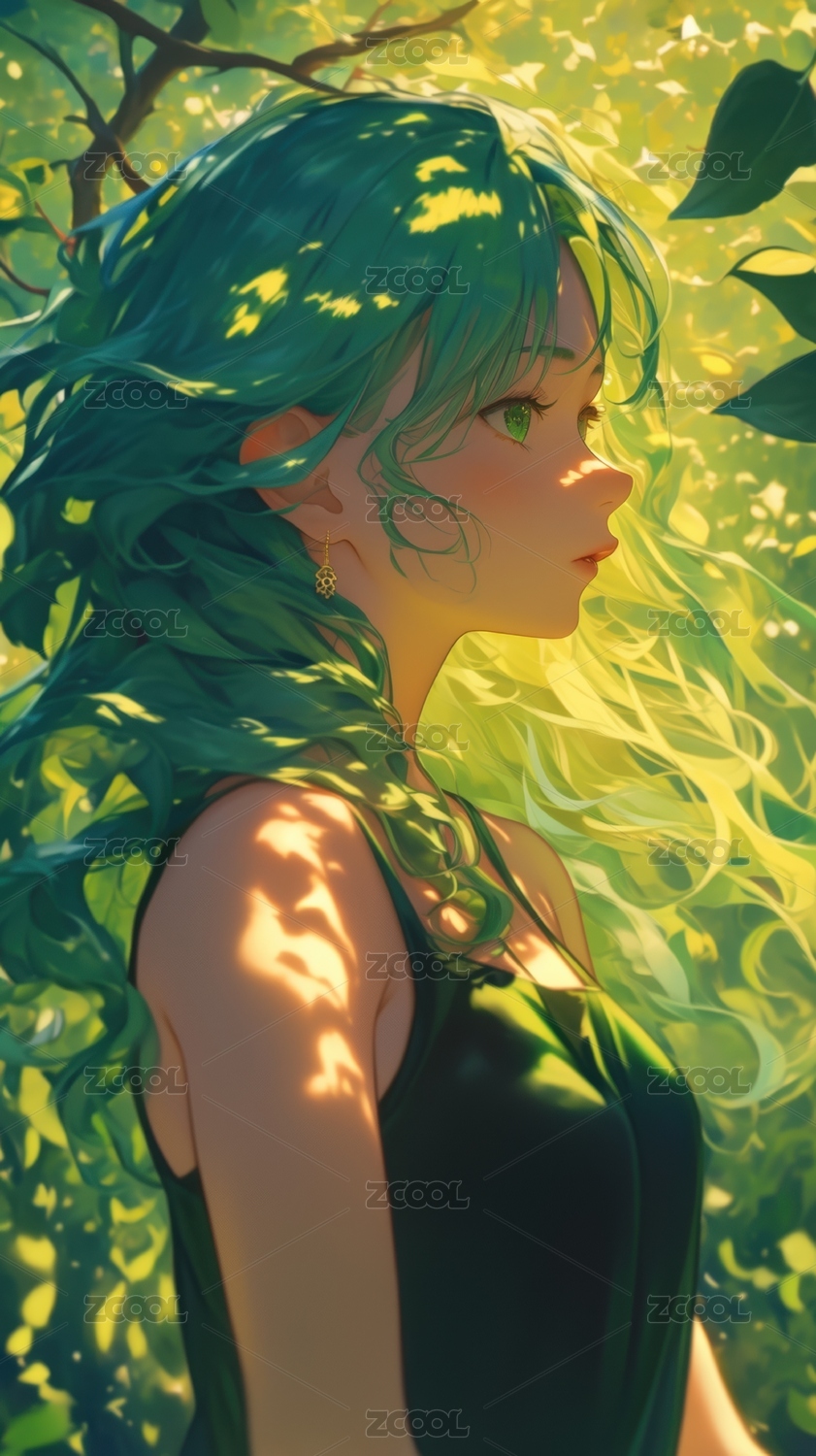 绿发少女在自然中的梦幻瞬间