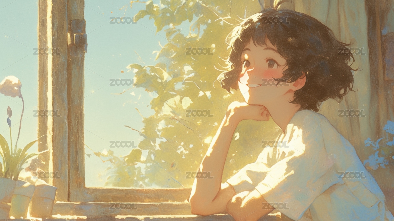 窗边沉思的少年