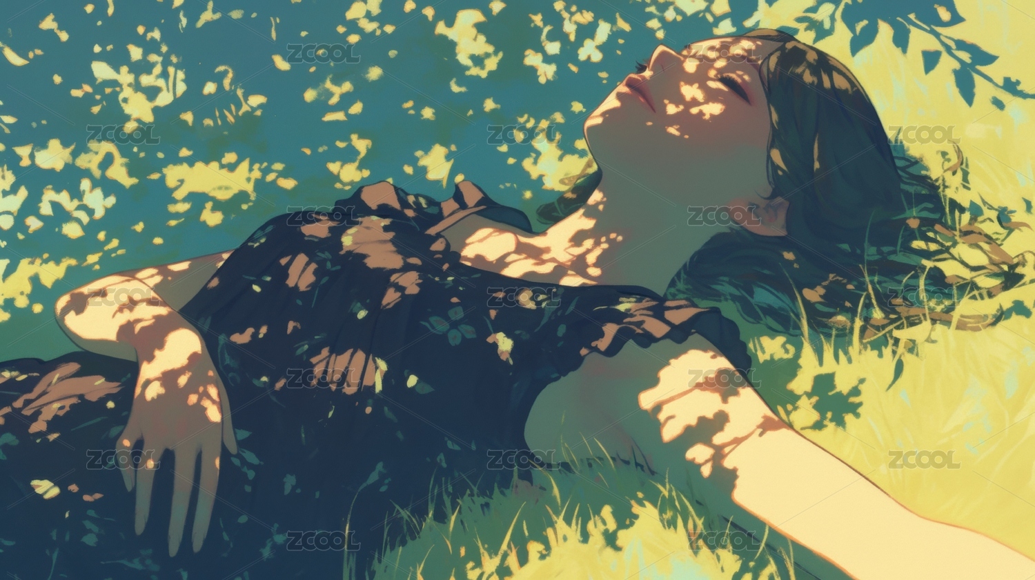 躺在花丛中的少女插画