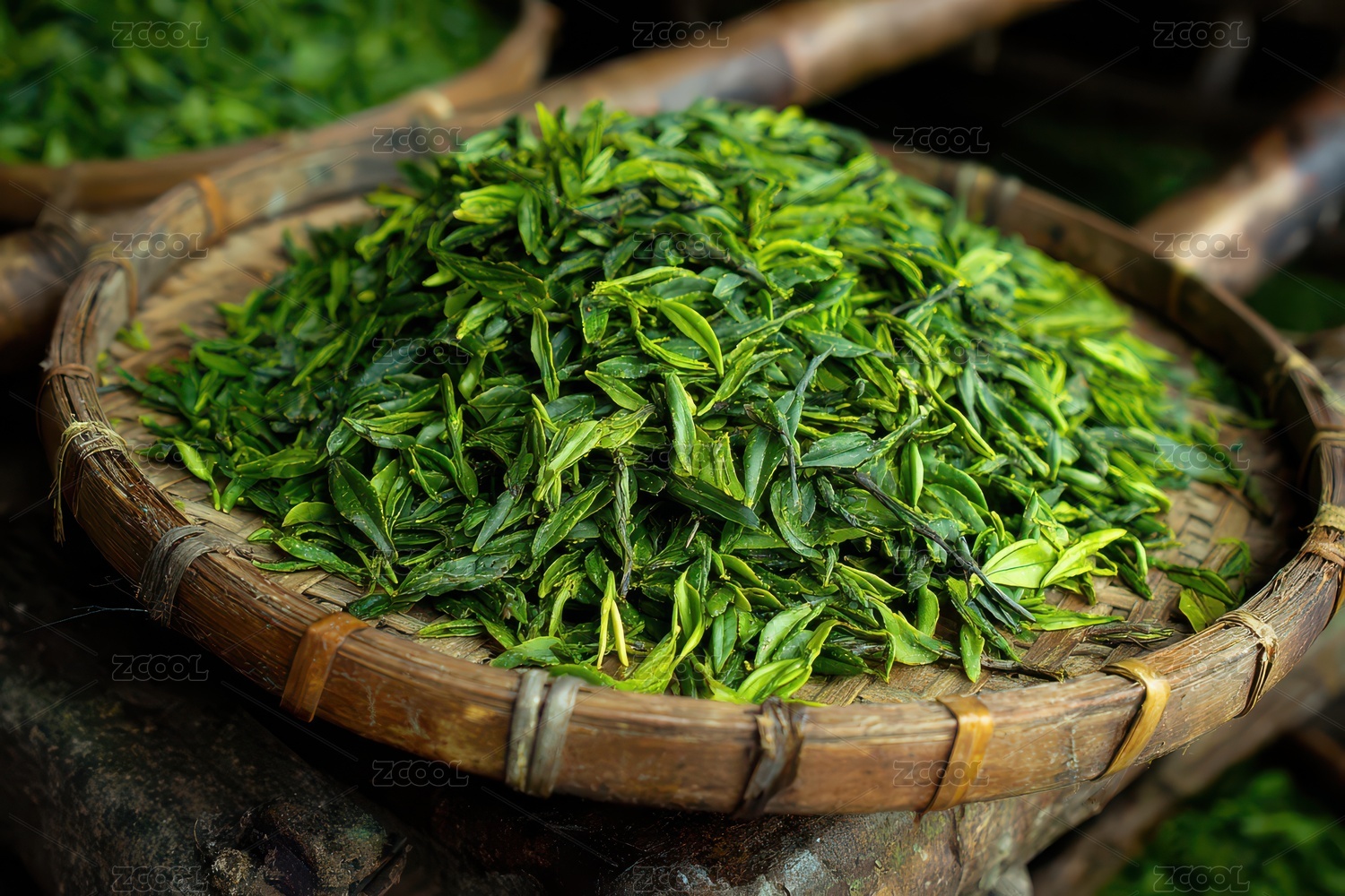 绿色,自然,特写,新鲜,茶叶,竹篮,编织,茶香