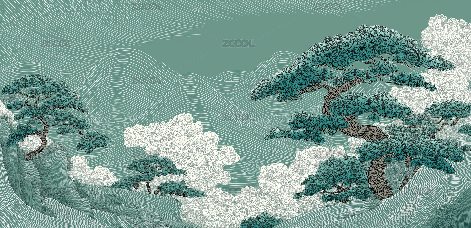 墨绿,山水,图景,国风,艺术,装饰,视觉,设计,时尚,现代