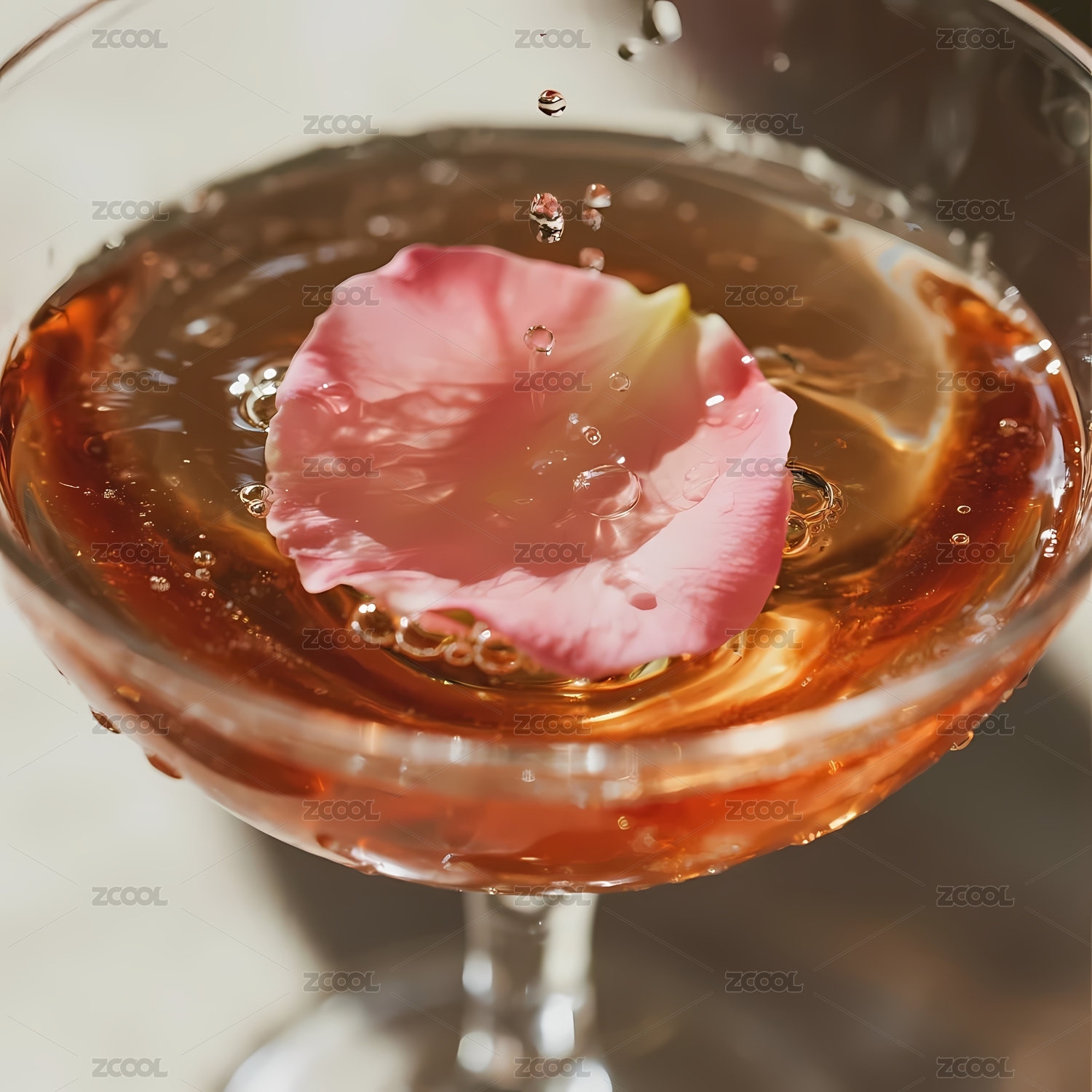 玫瑰花瓣漂浮于琥珀色饮品中