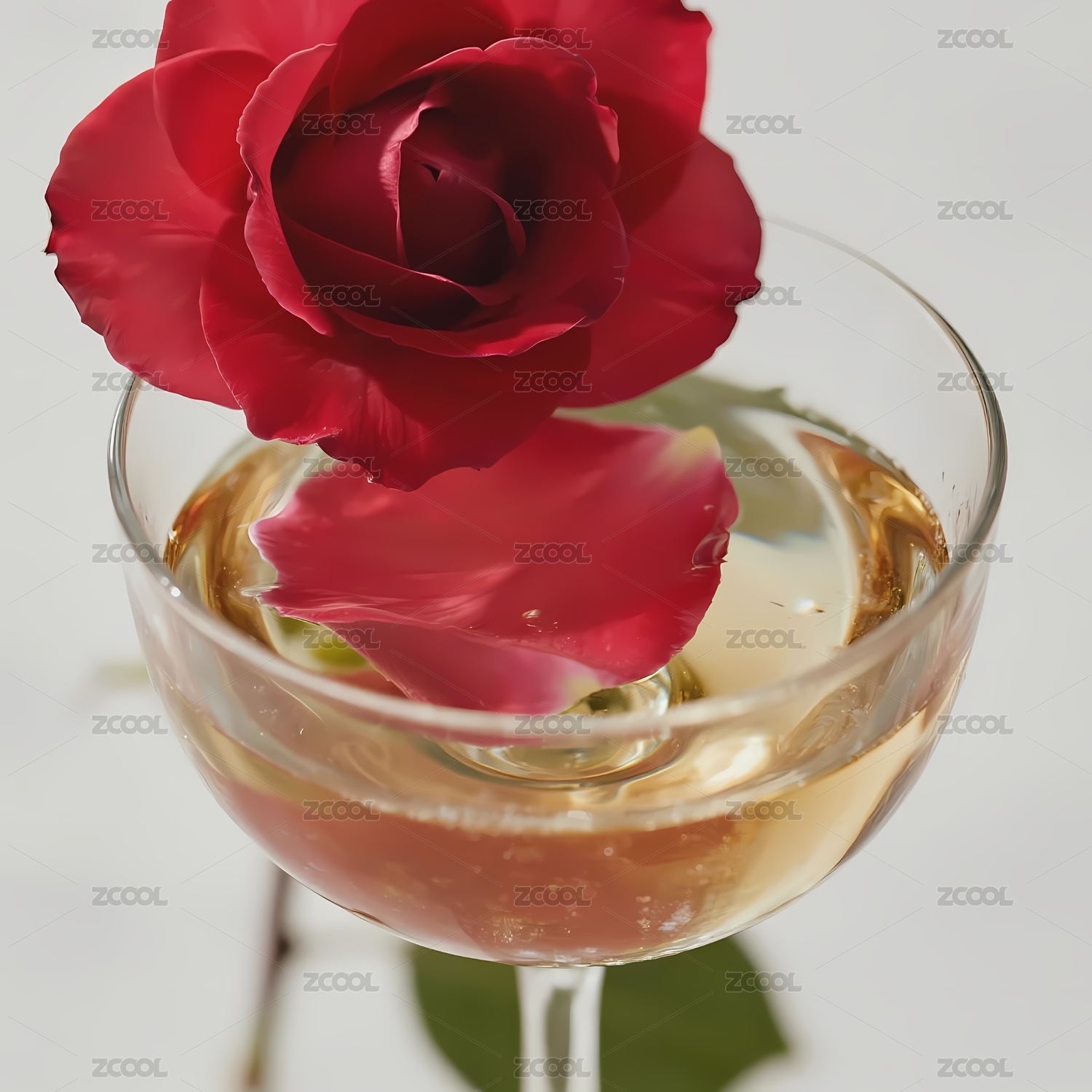 玫瑰花瓣漂浮于酒杯中的液体