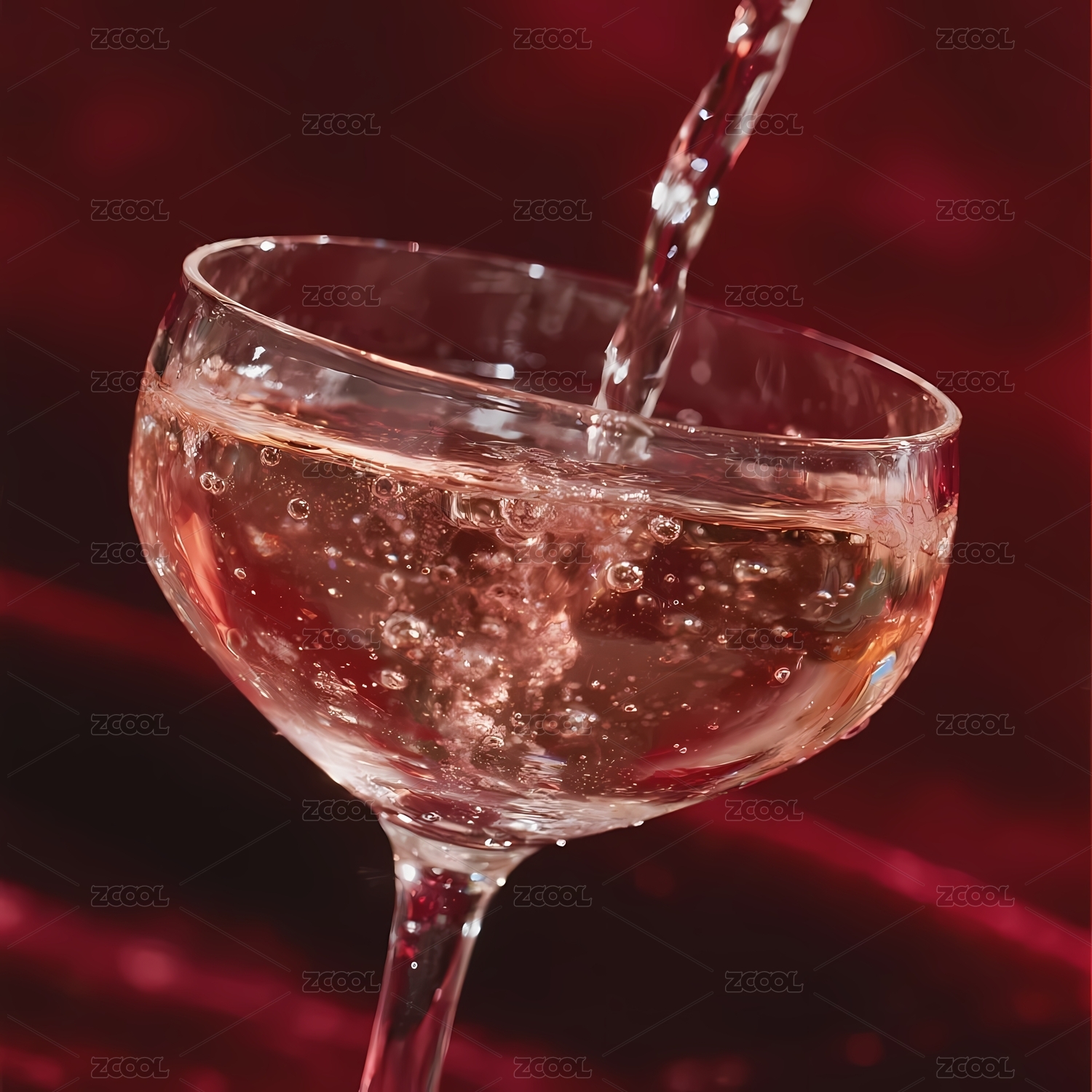 粉红色气泡酒在玻璃杯中溅起的瞬间