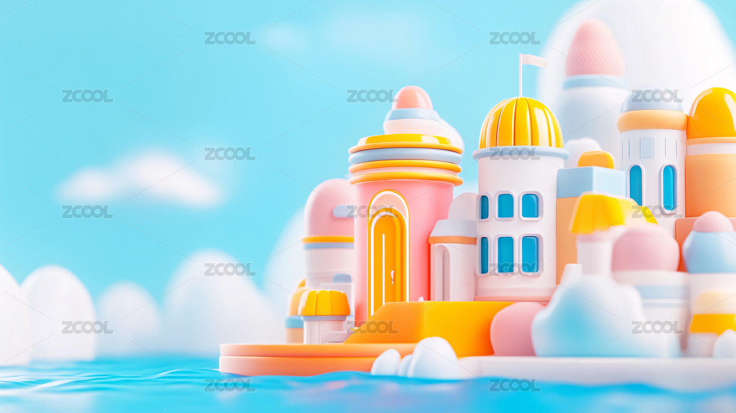 童话小镇城市天际线3D渲染蓝色背景