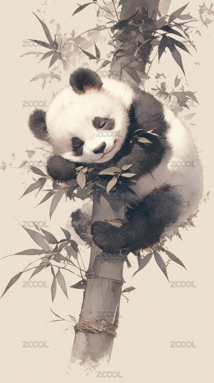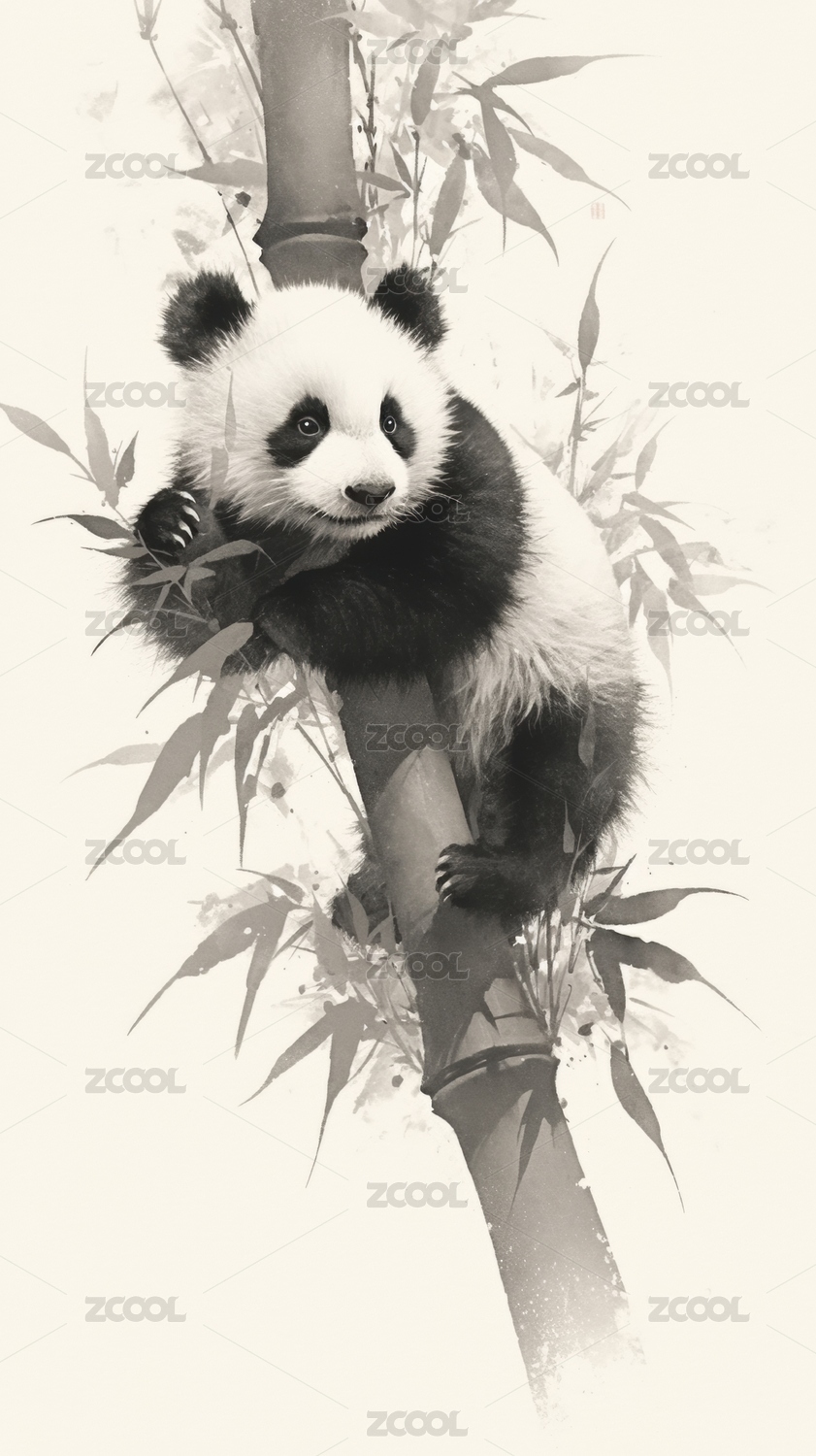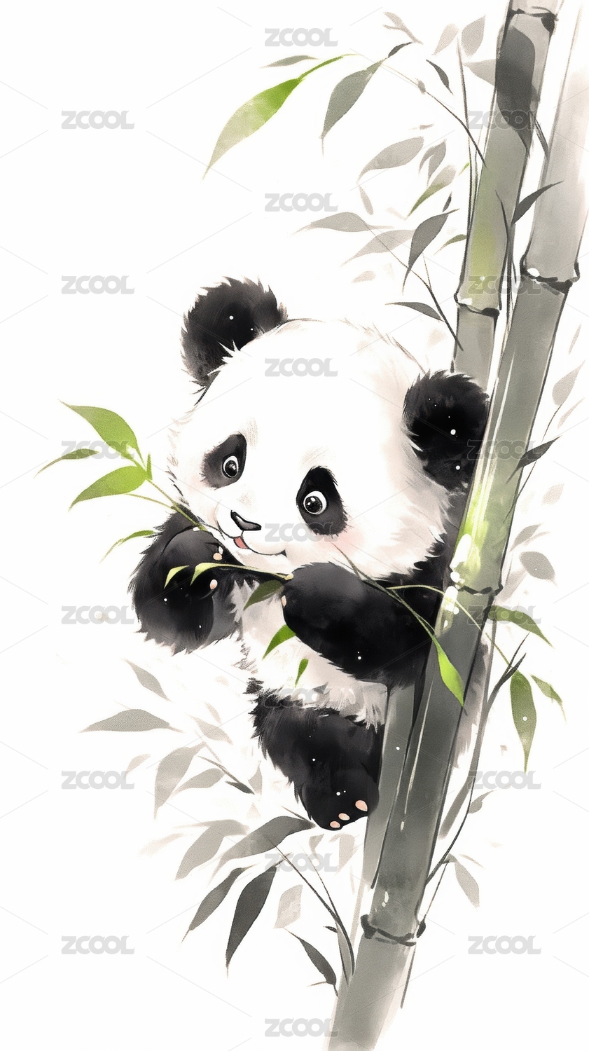 水墨熊猫宝宝攀爬竹子