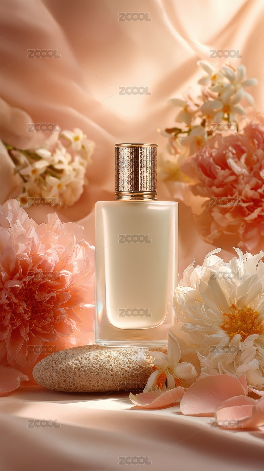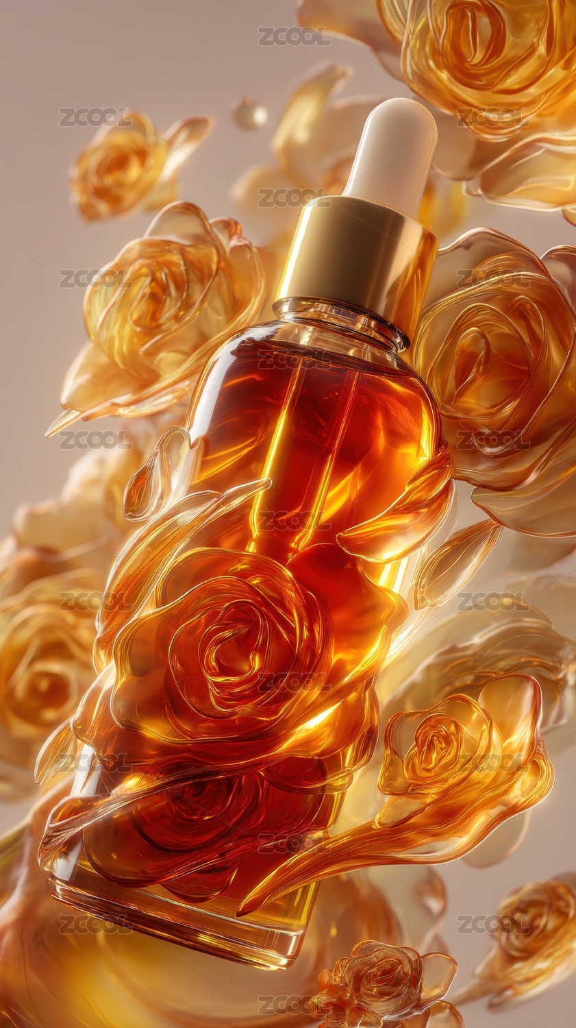 香水瓶与水花玫瑰环绕的优雅瞬间
