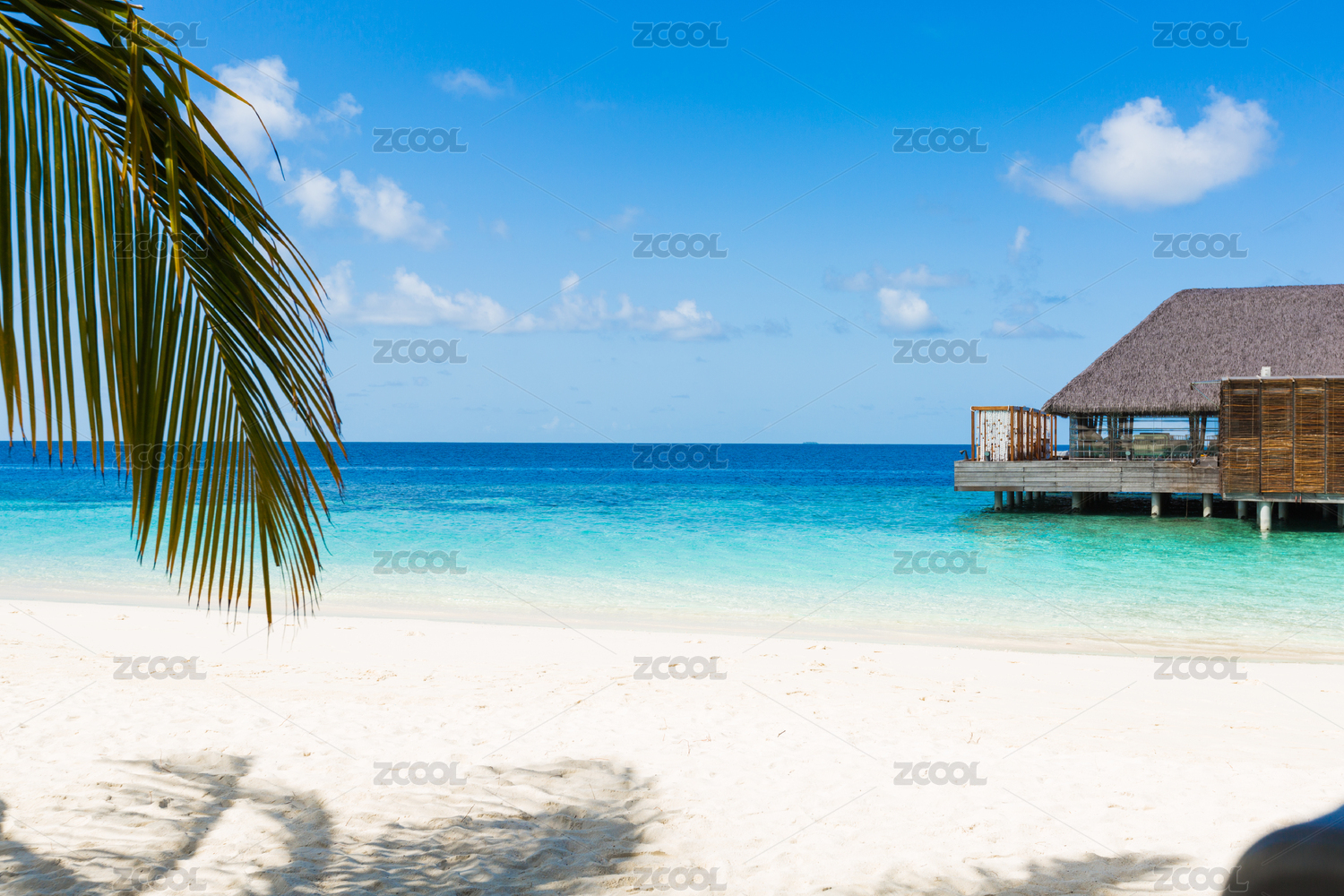 碧海蓝天和海边的热带植物棕榈树和水上餐厅酒吧