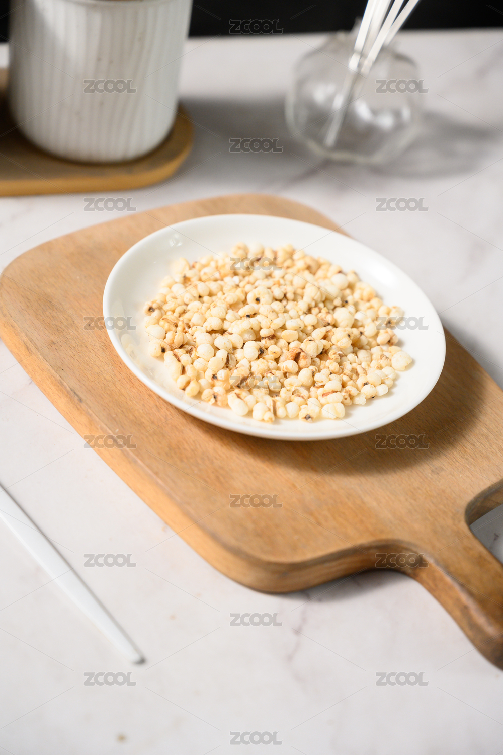 桌面上的玻璃盘子里的干爽且美味的薏米
