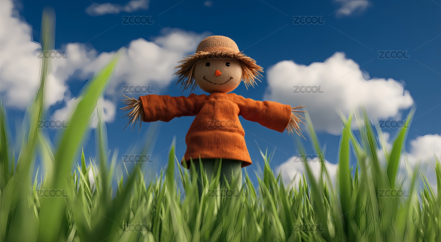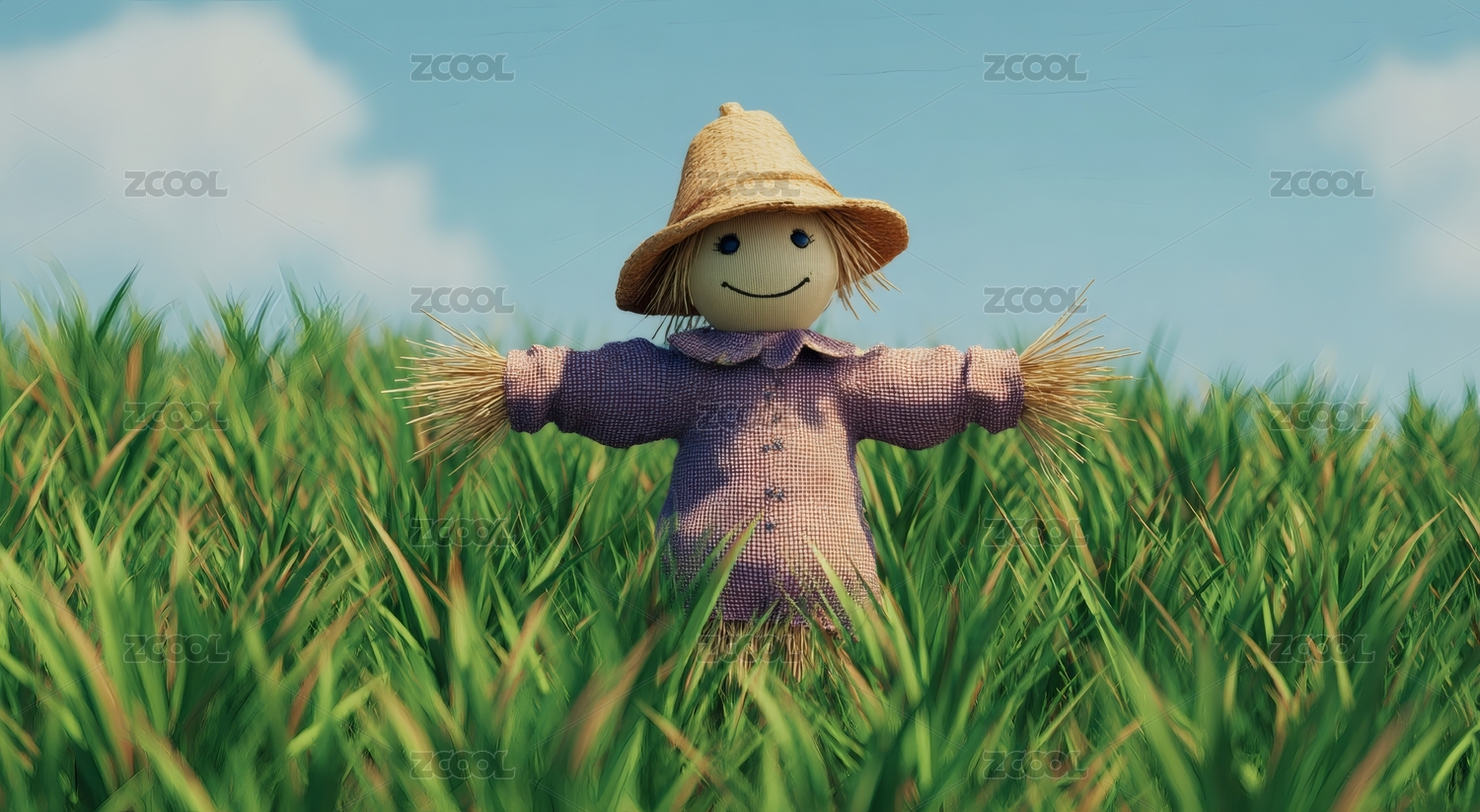 稻田快乐稻草人蓝天白云