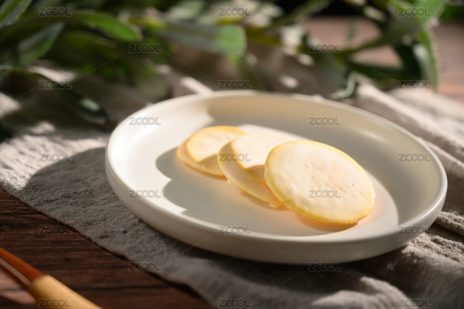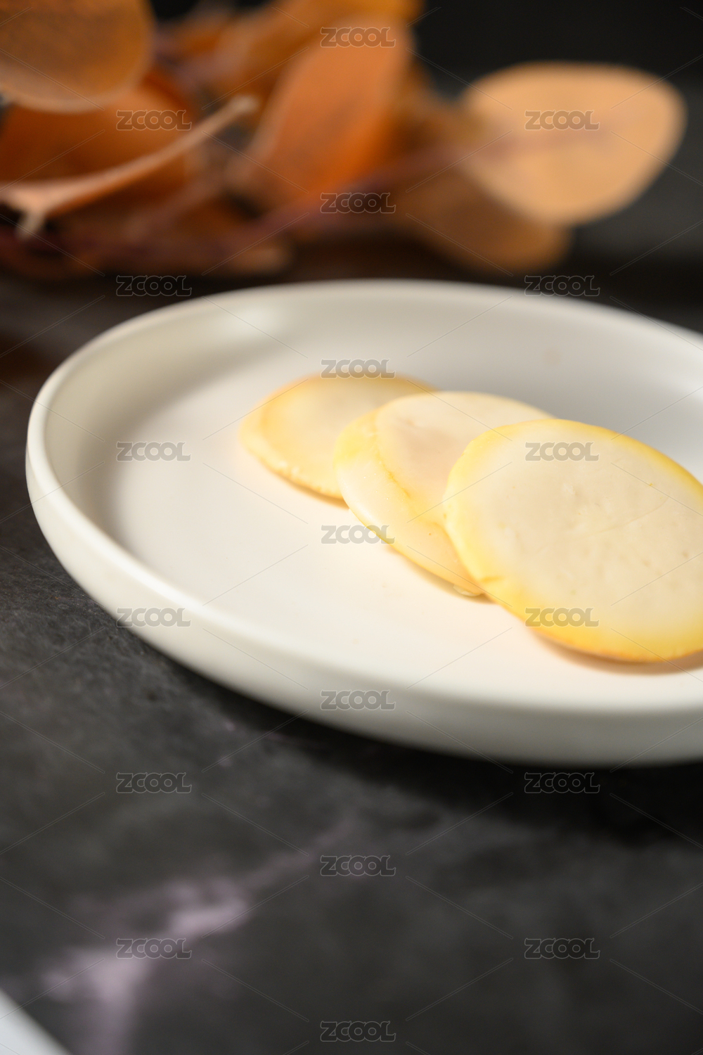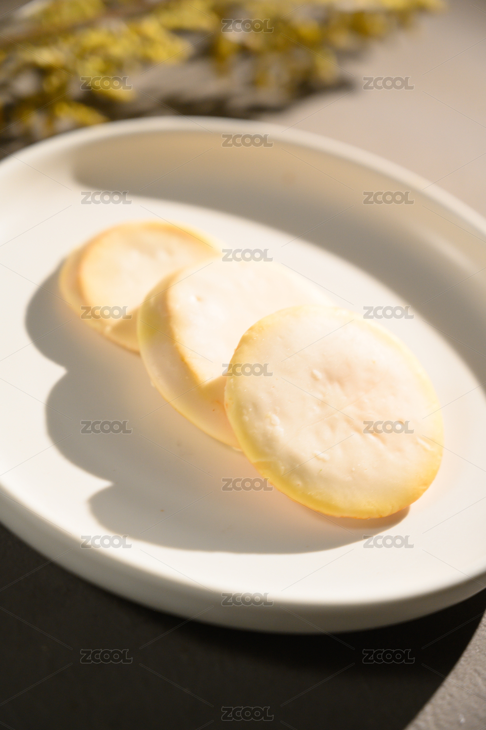 桌面上的盘子里的美味可口的白巧克力橙子片