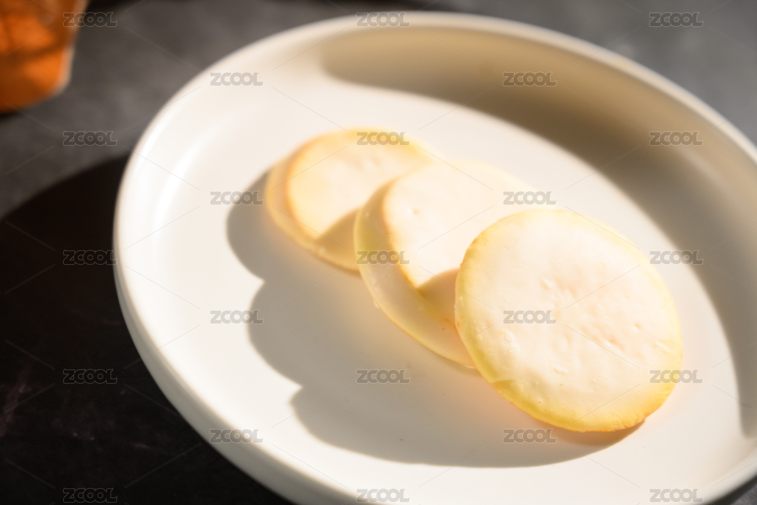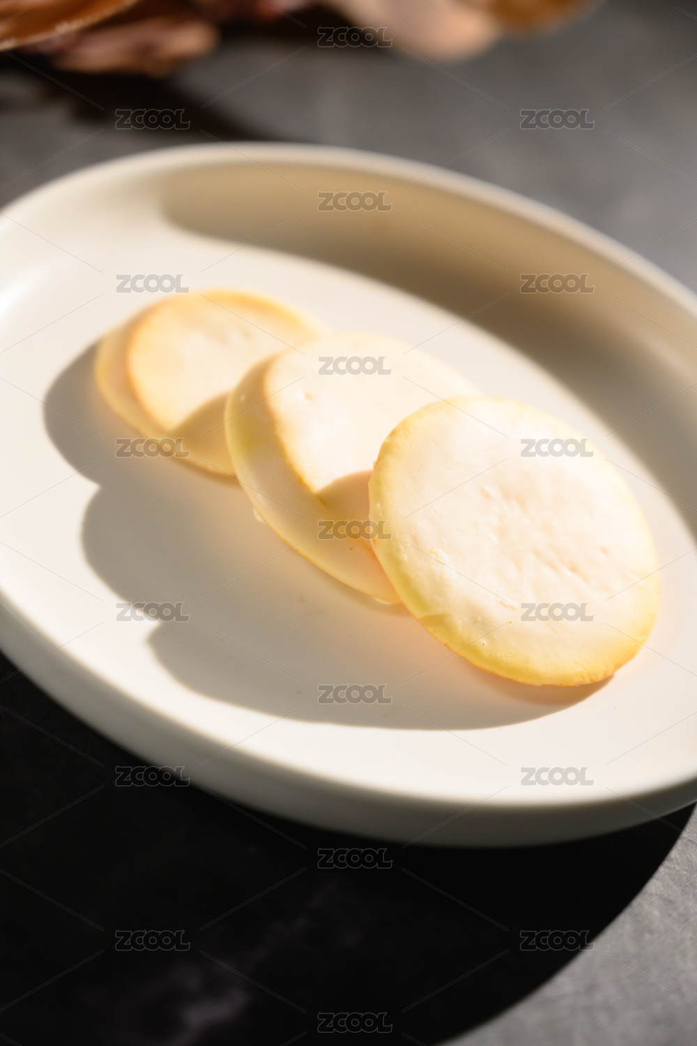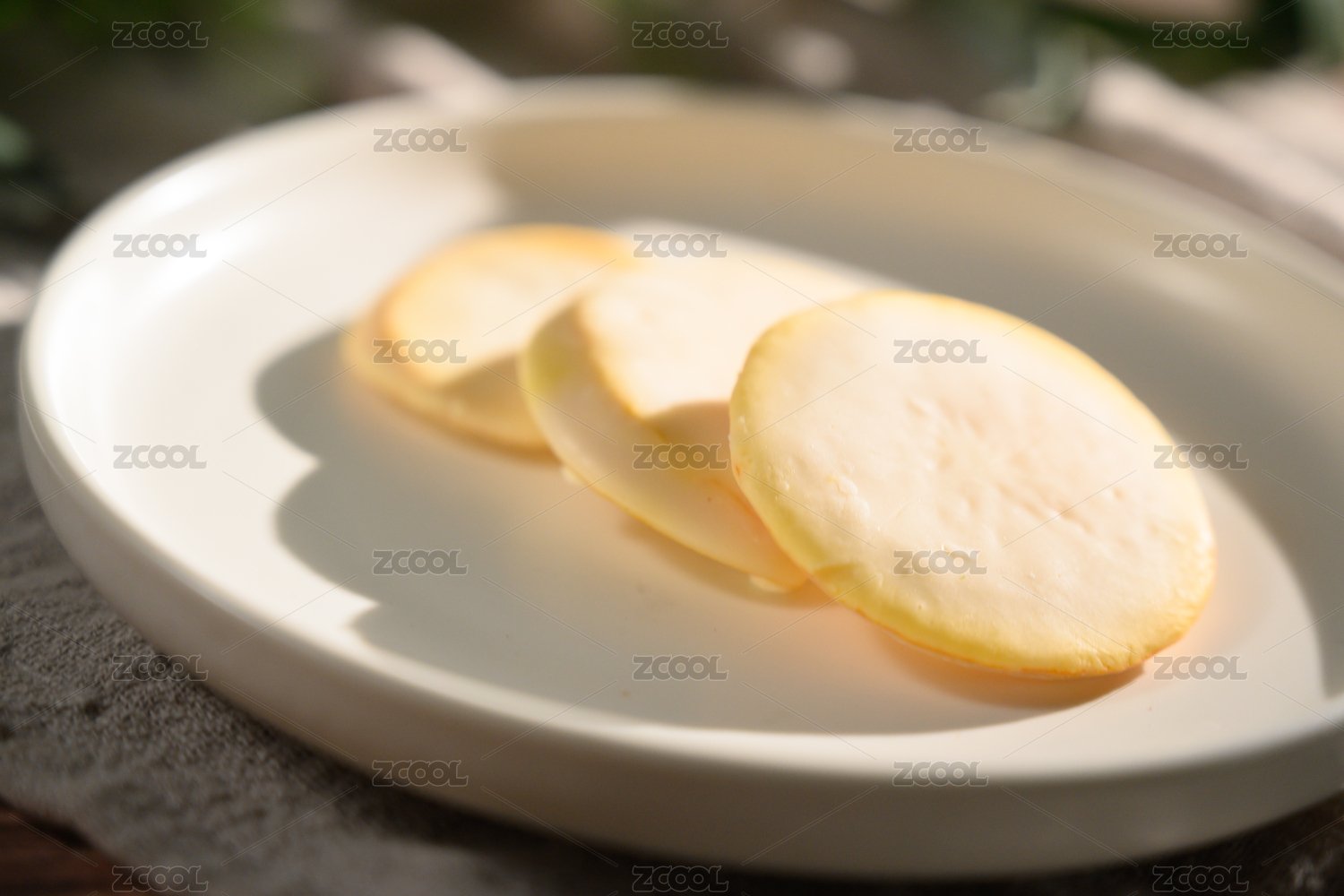 桌面上的盘子里的美味可口的白巧克力橙子片
