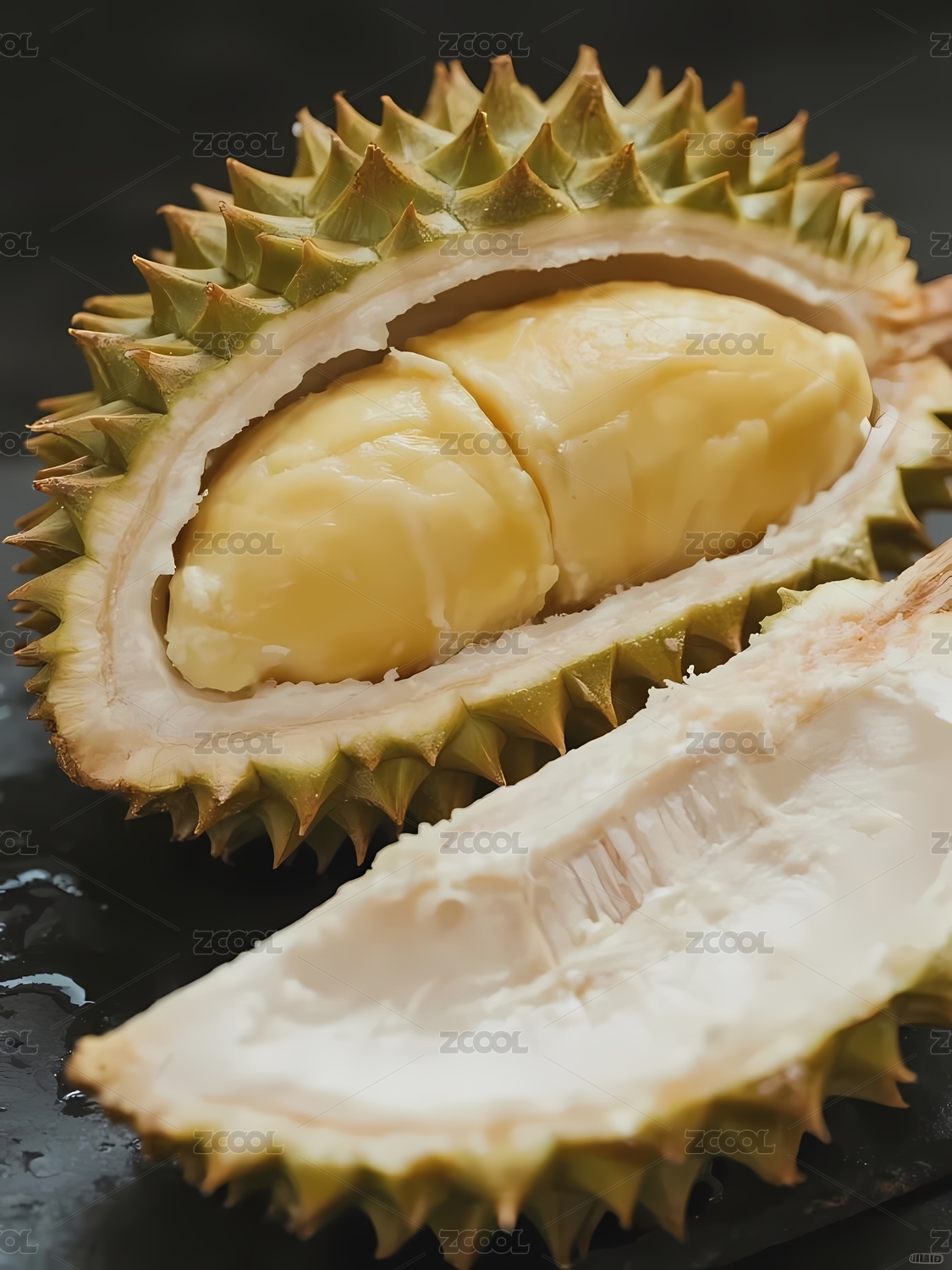 新鲜榴莲切开展示金黄色果肉