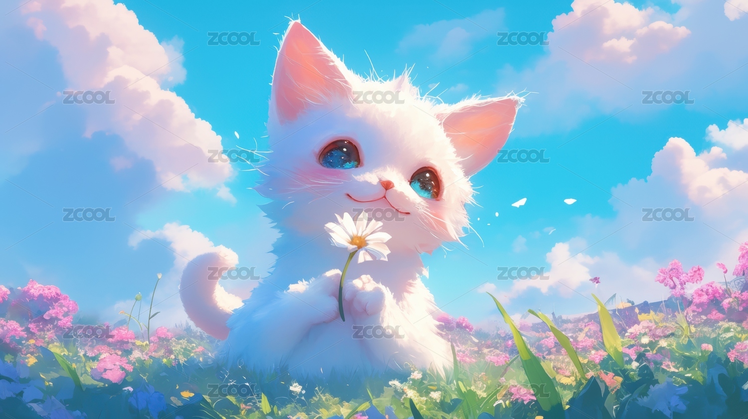 白猫手捧雏菊置身花海蓝天