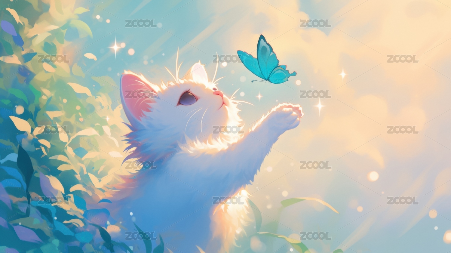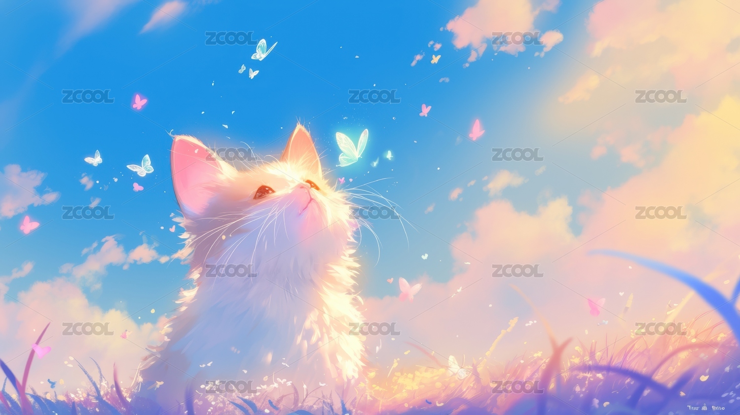 白猫与蝴蝶在花丛中的梦幻场景