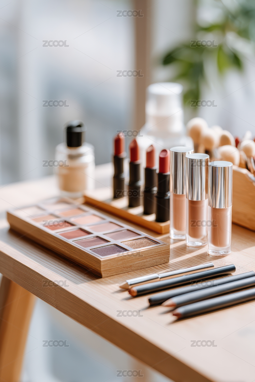 眼影盘、口红与化妆刷的优雅陈列