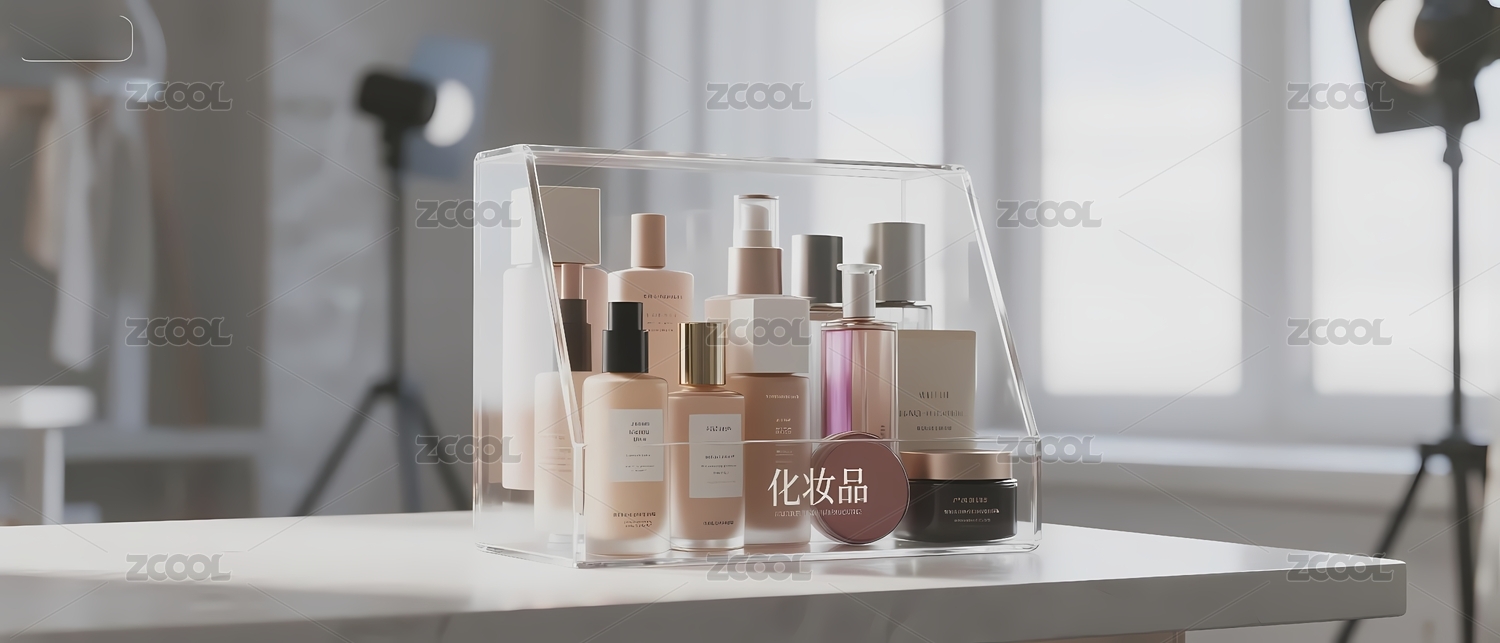 透明收纳盒中的护肤品展示