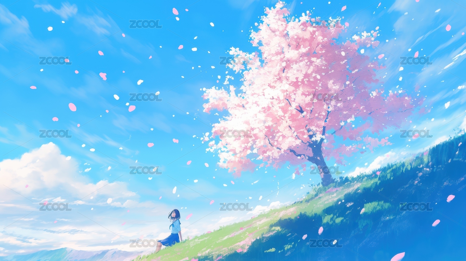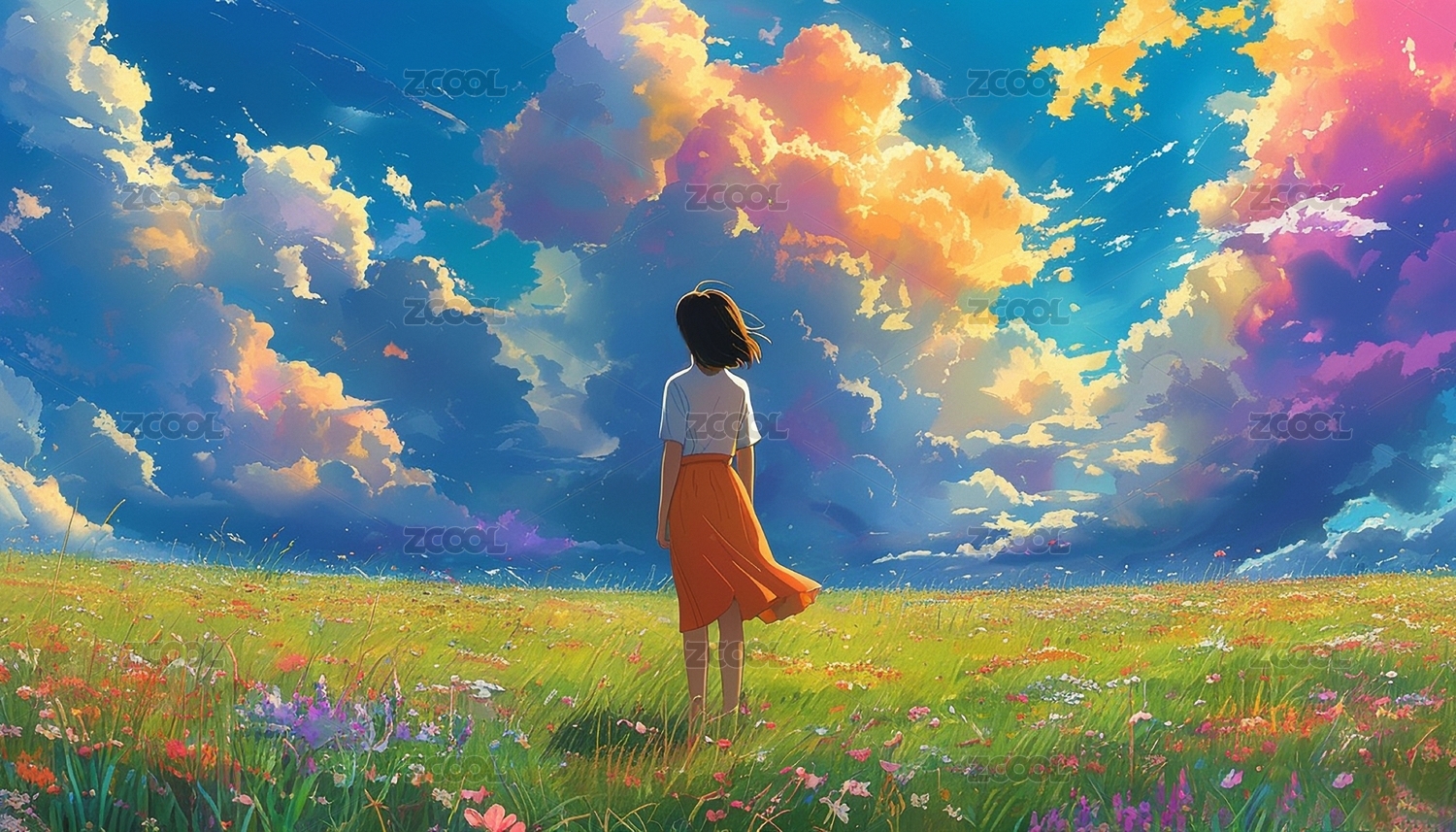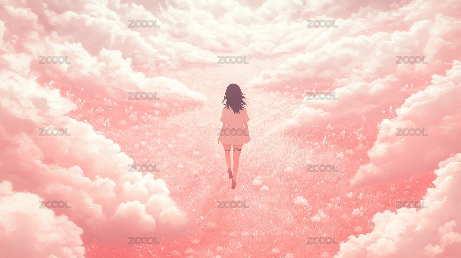 粉色,云朵,艺术,治愈,唯美,清新,浪漫,自然,背影,插画