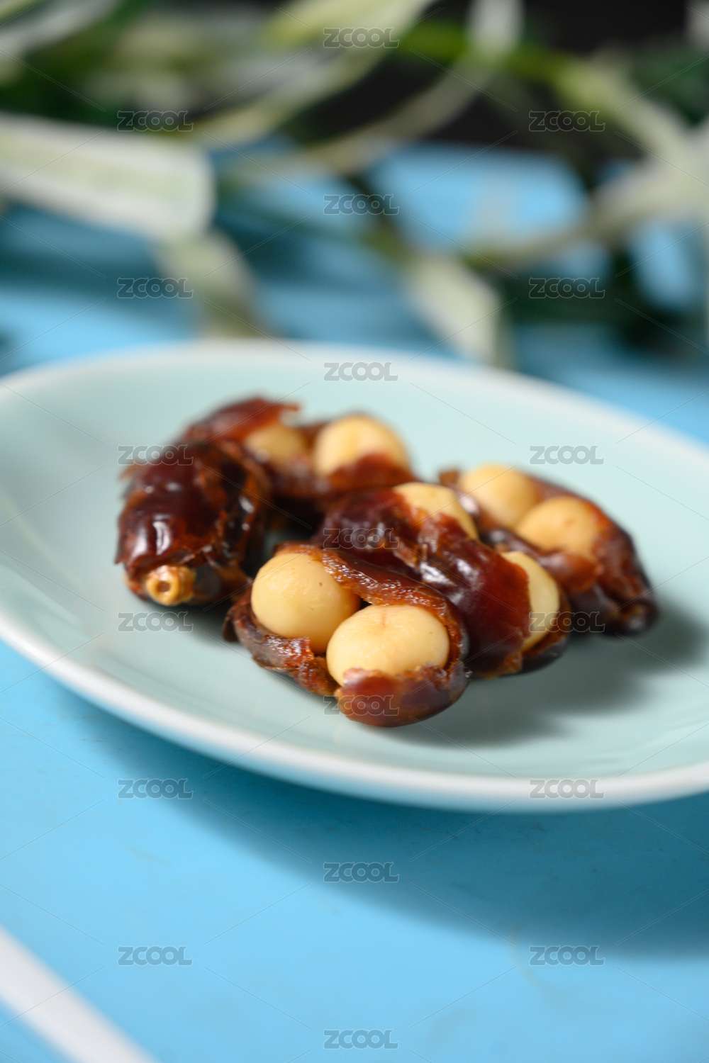 桌面上的盘子里的美味可口的椰枣夏威夷果仁