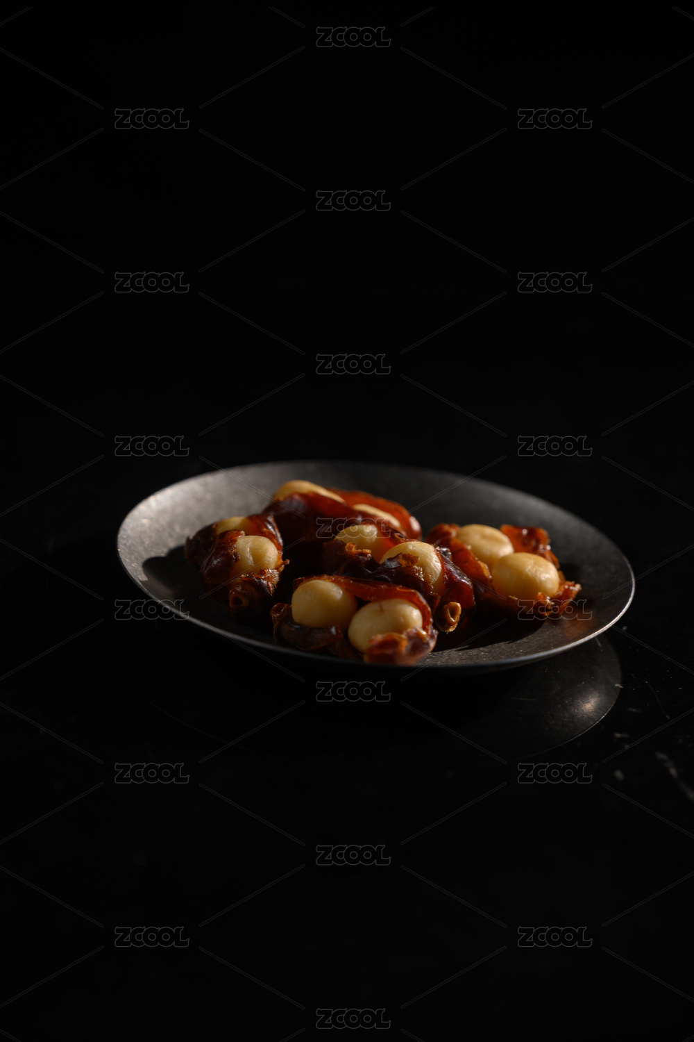 桌面上的盘子里的美味可口的椰枣夏威夷果仁