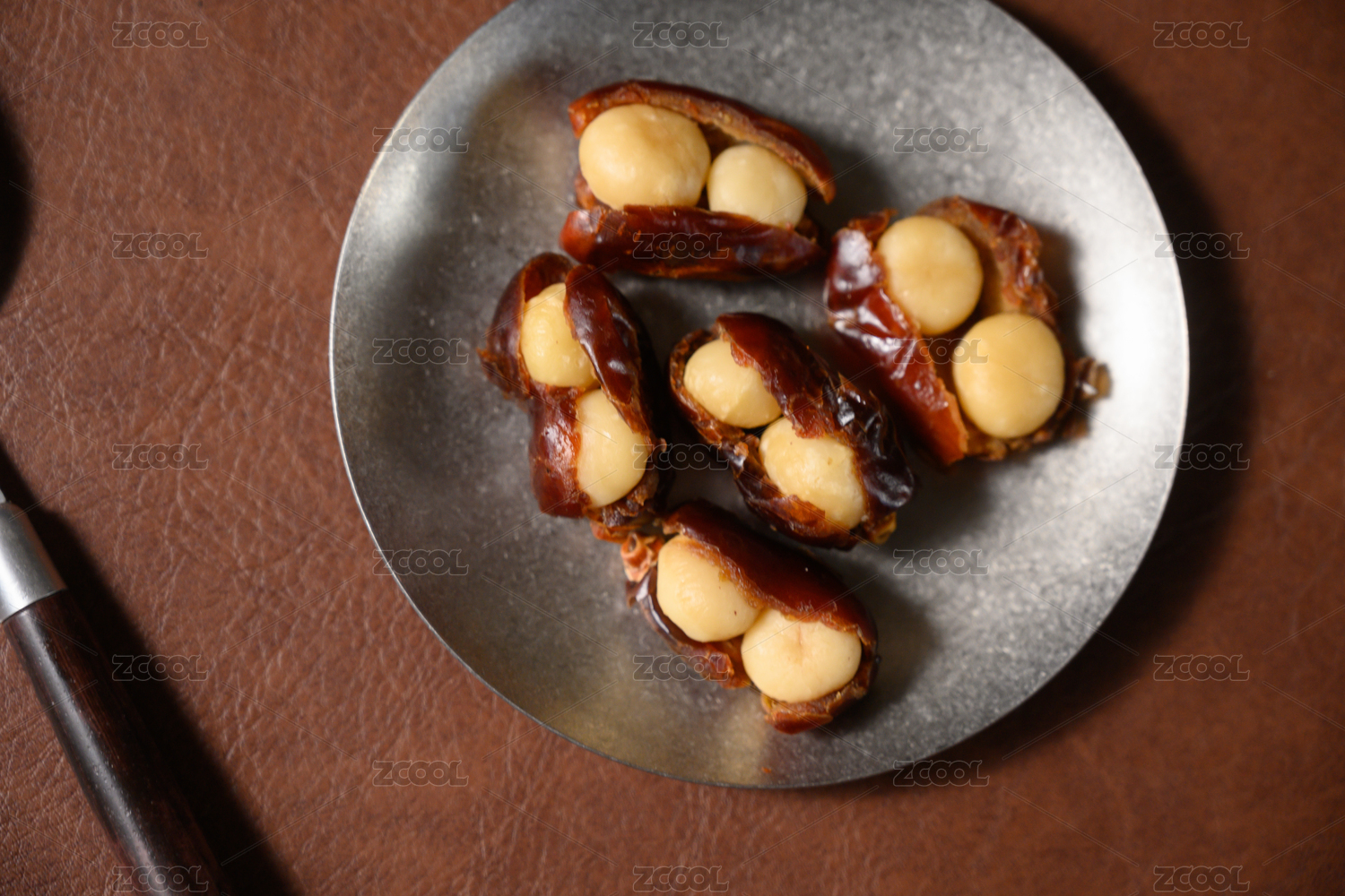 桌面上的盘子里的美味可口的椰枣夏威夷果仁