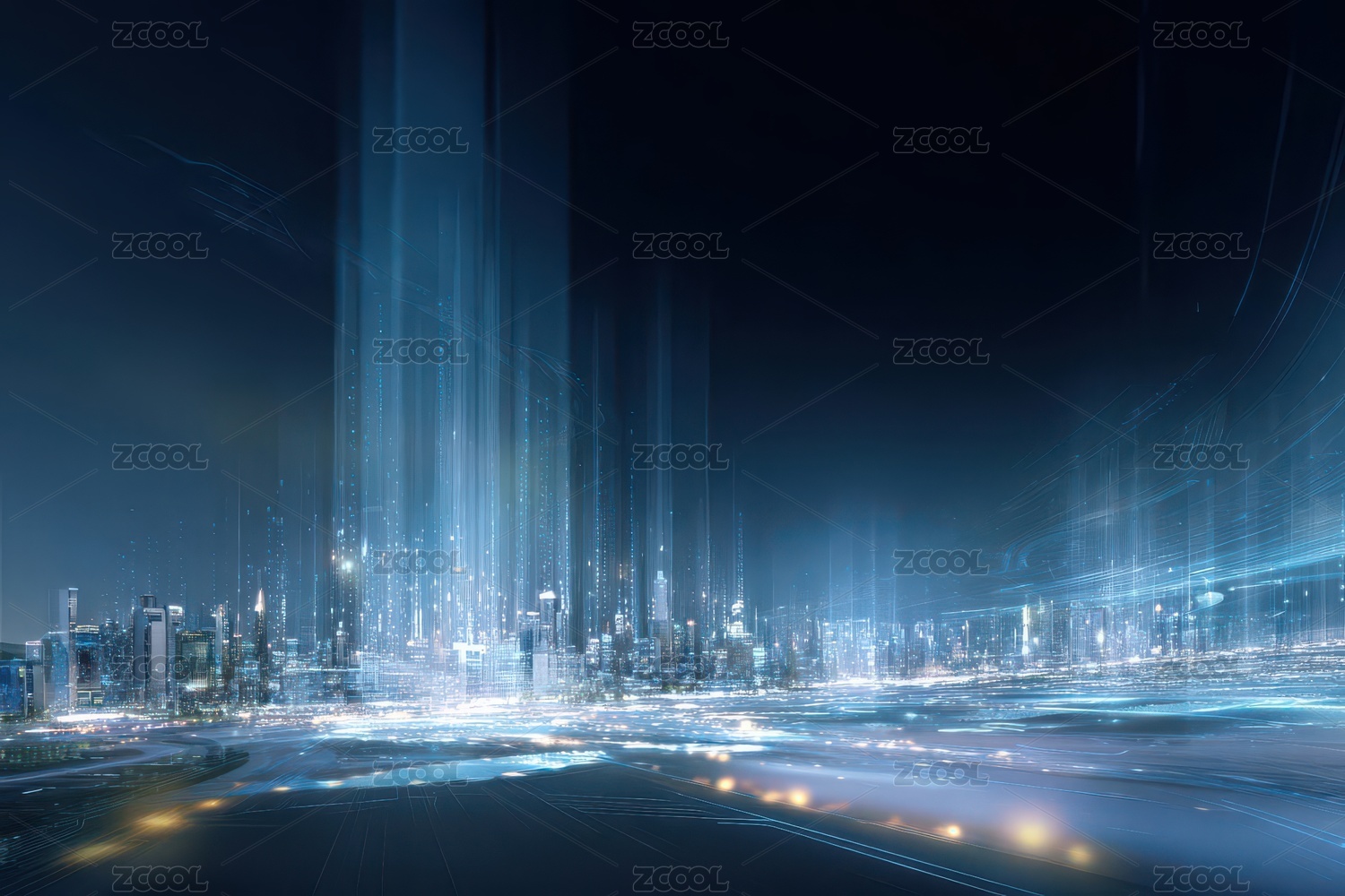 抽象数据流线条发光未来城市轮廓蓝紫色渐变