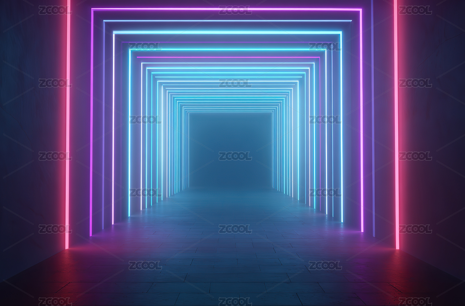 走廊, 霓虹灯, 光效, 几何图形, 色彩, 紫色, 蓝色, 粉色, 橙色, 反射