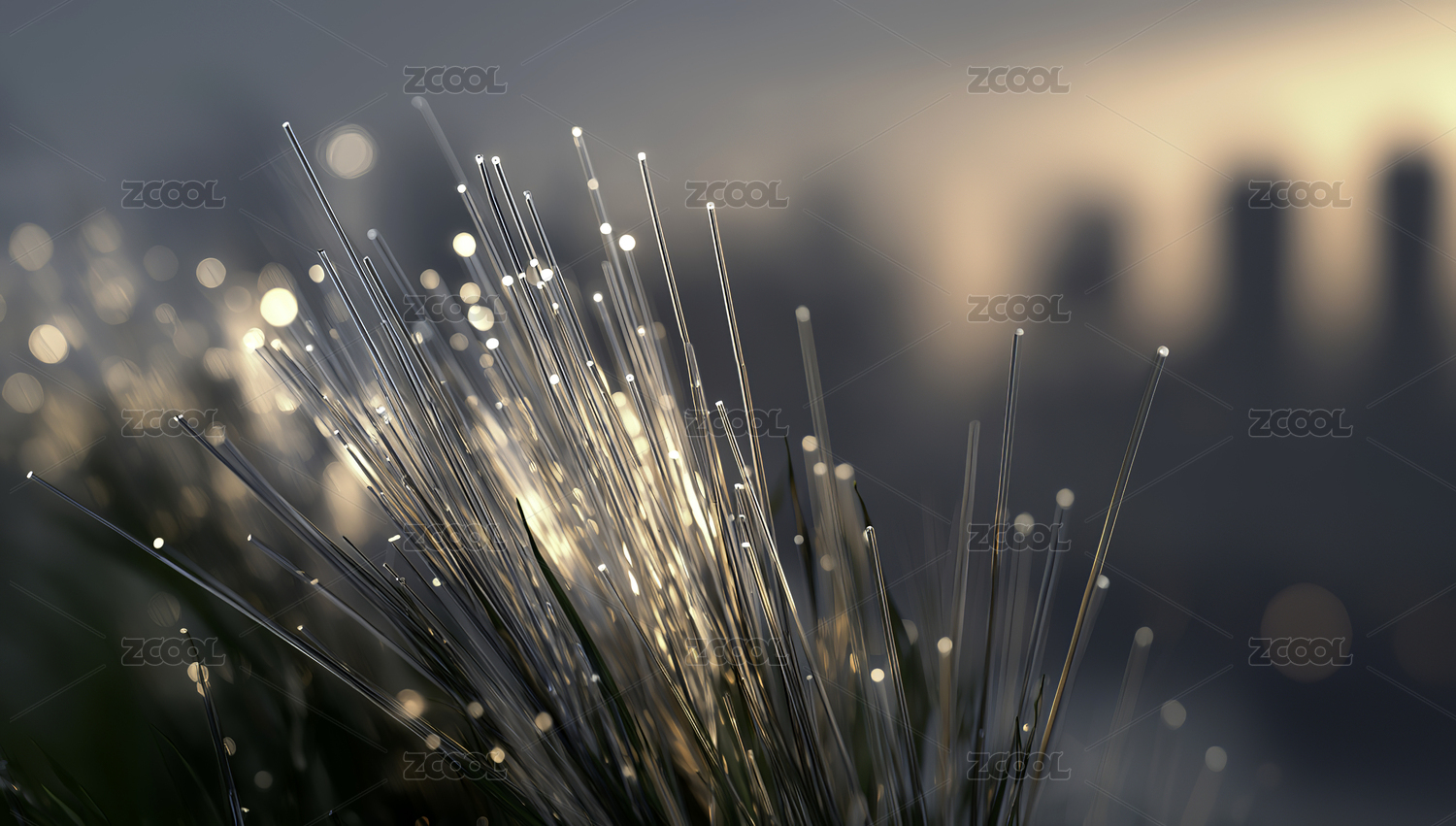 光纤电缆和模糊的城市天际线