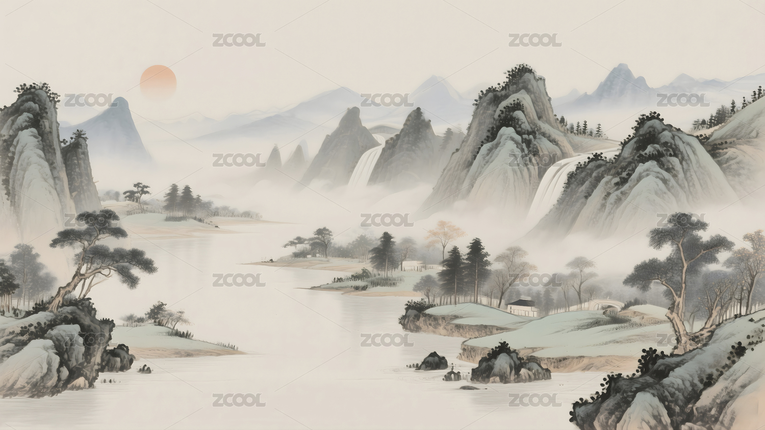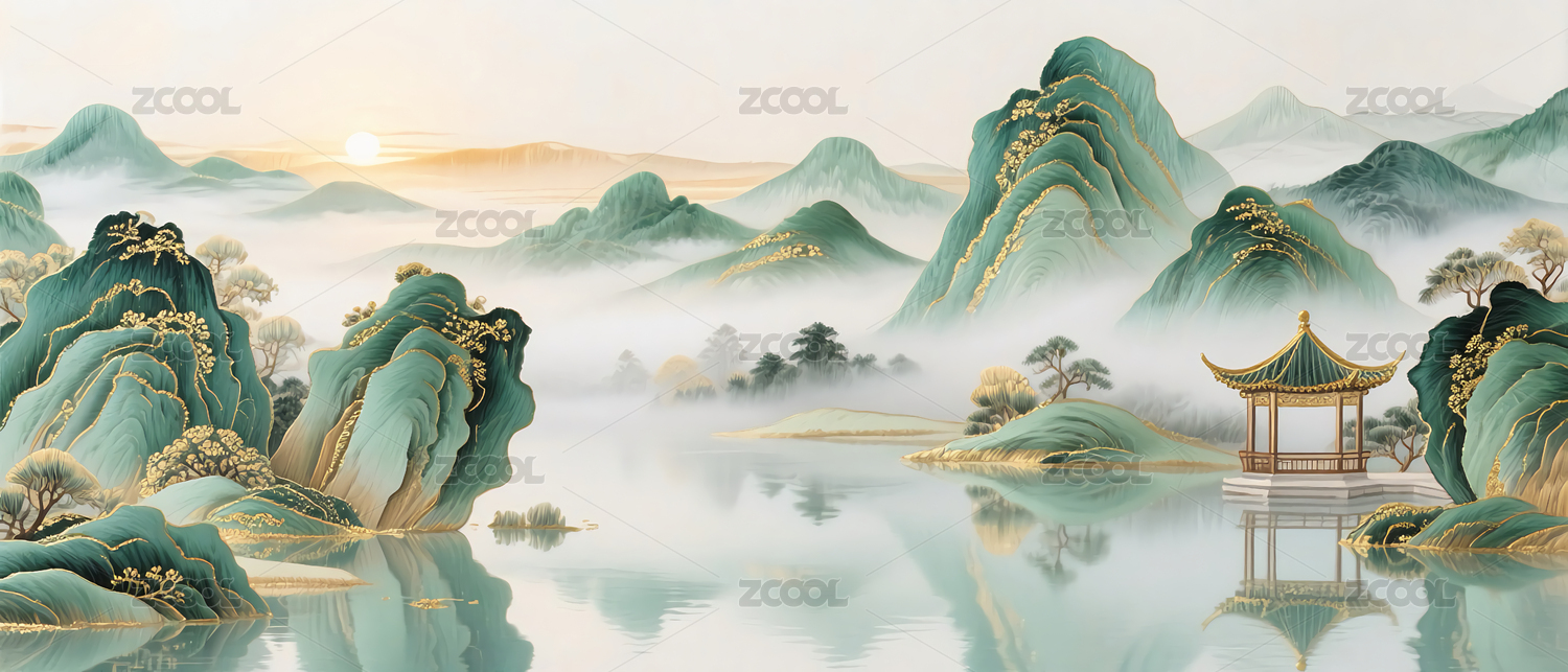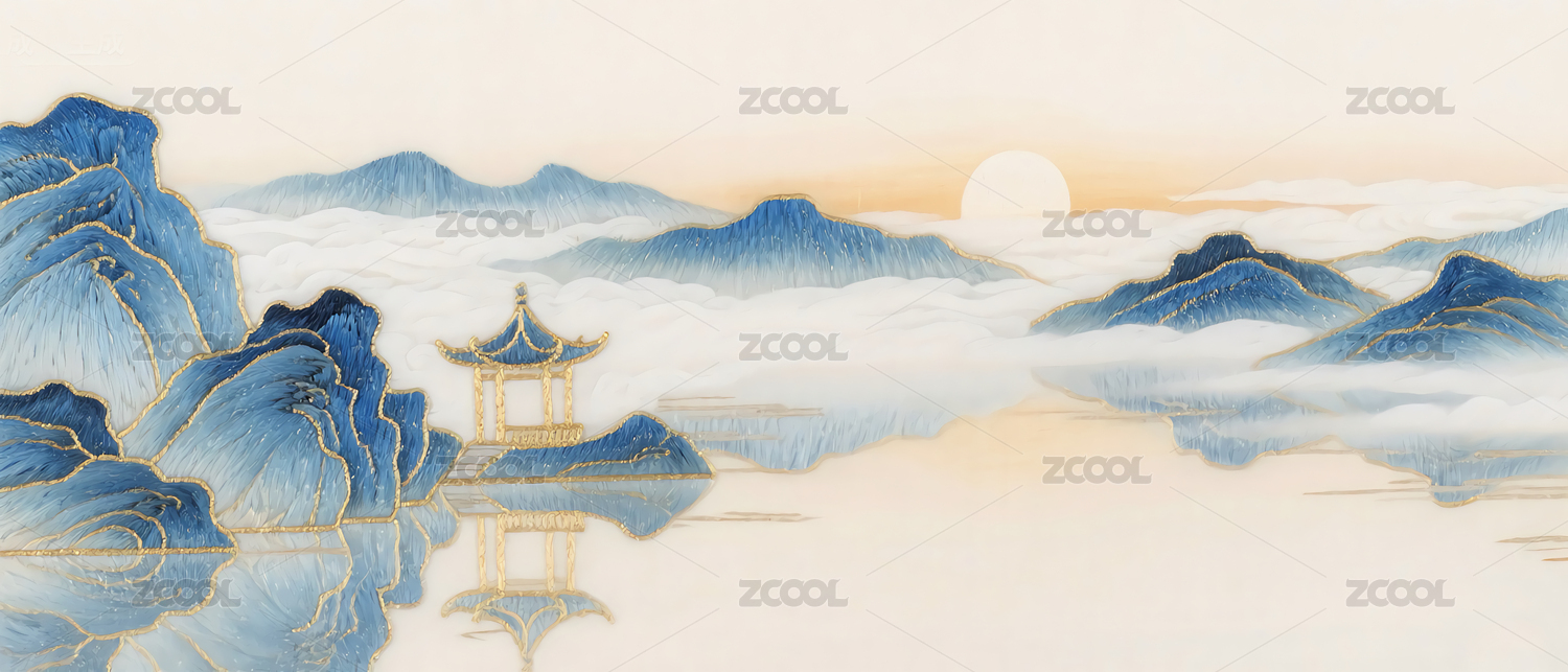 高山,风景,天空,壁纸,山峰,古建筑,背景,渐变,光影,国潮