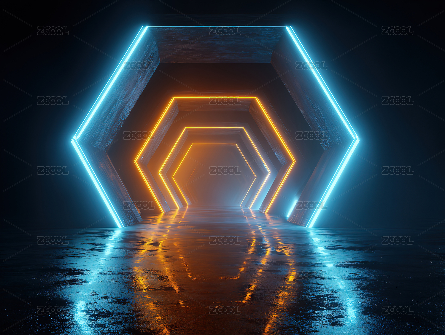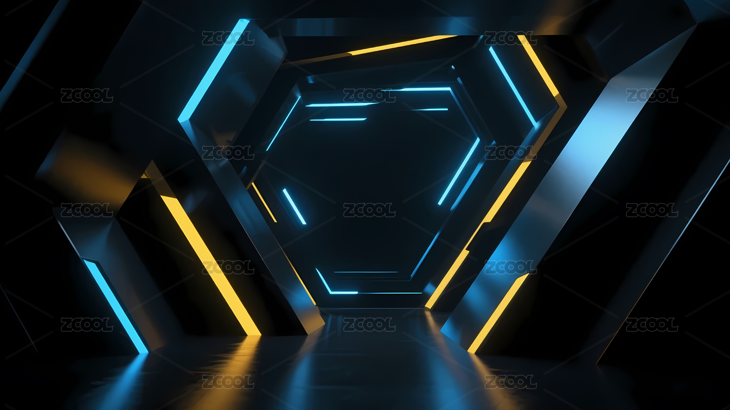 六边形走廊蓝黄霓虹灯条