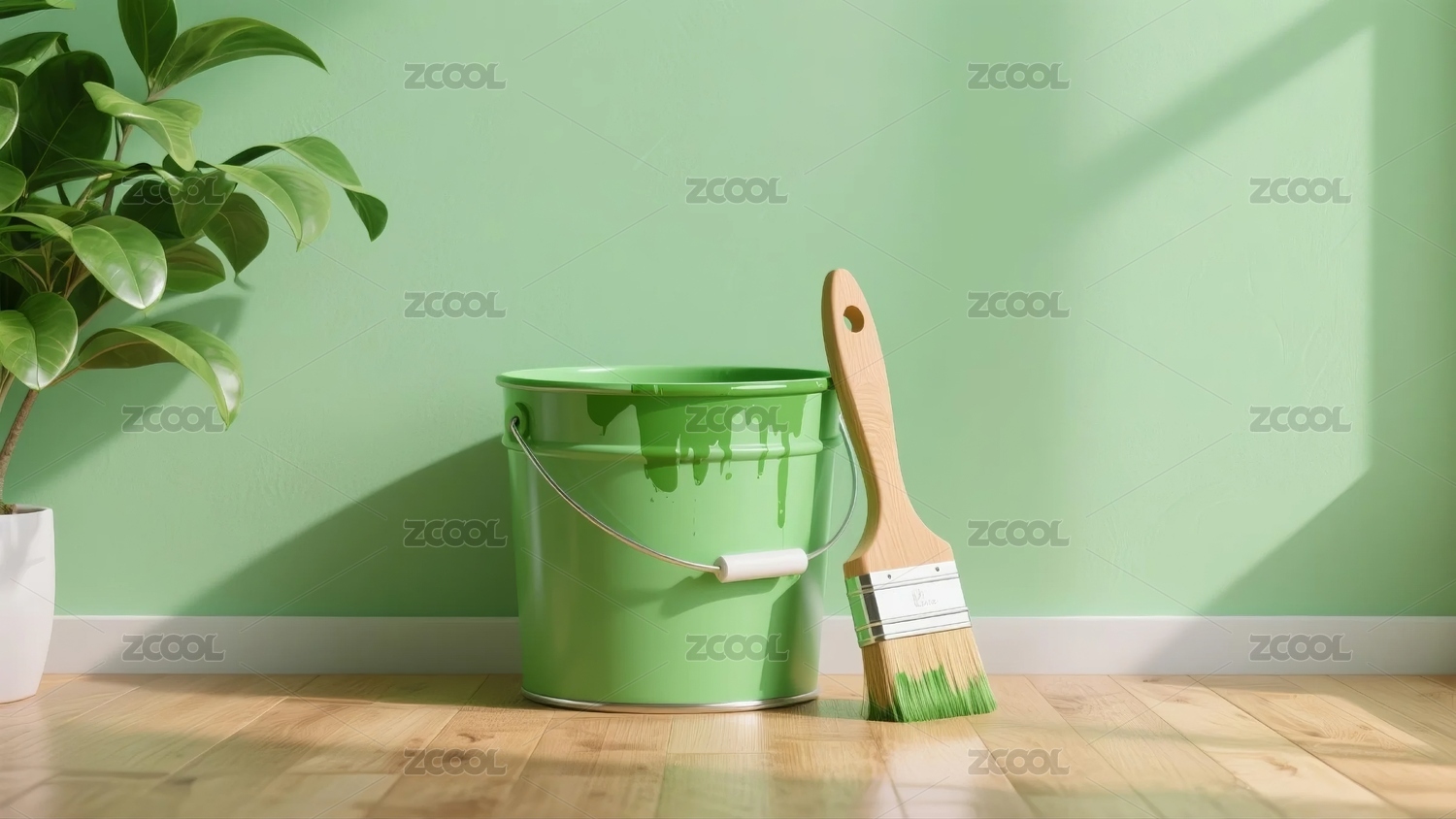 绿色油漆桶与画刷室内场景
