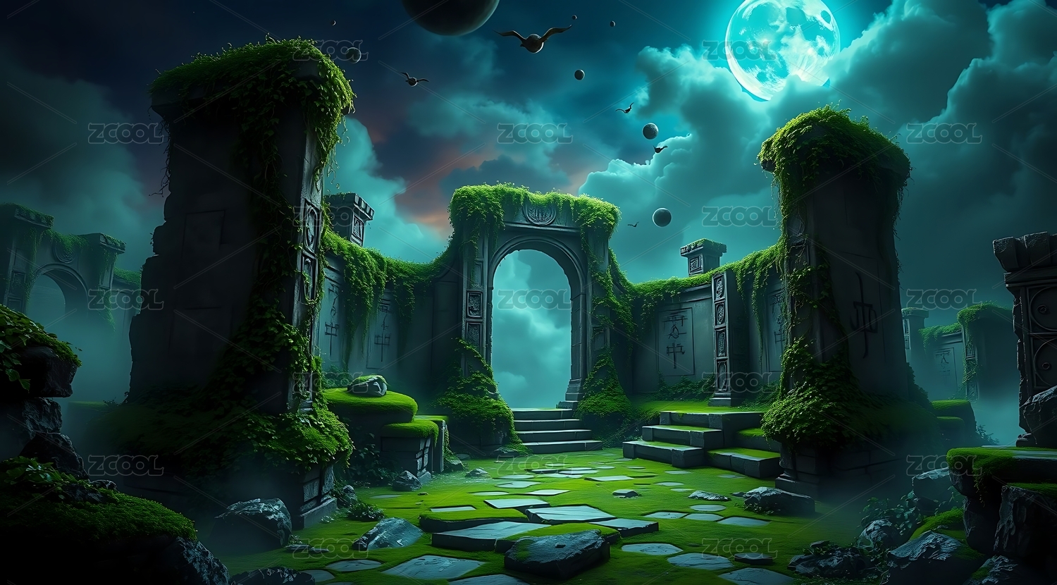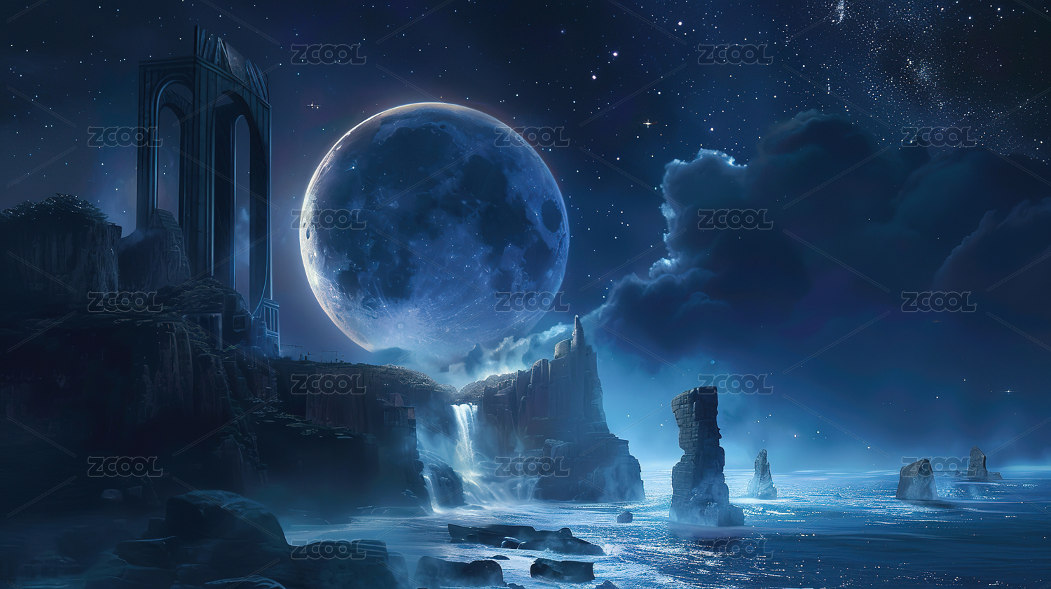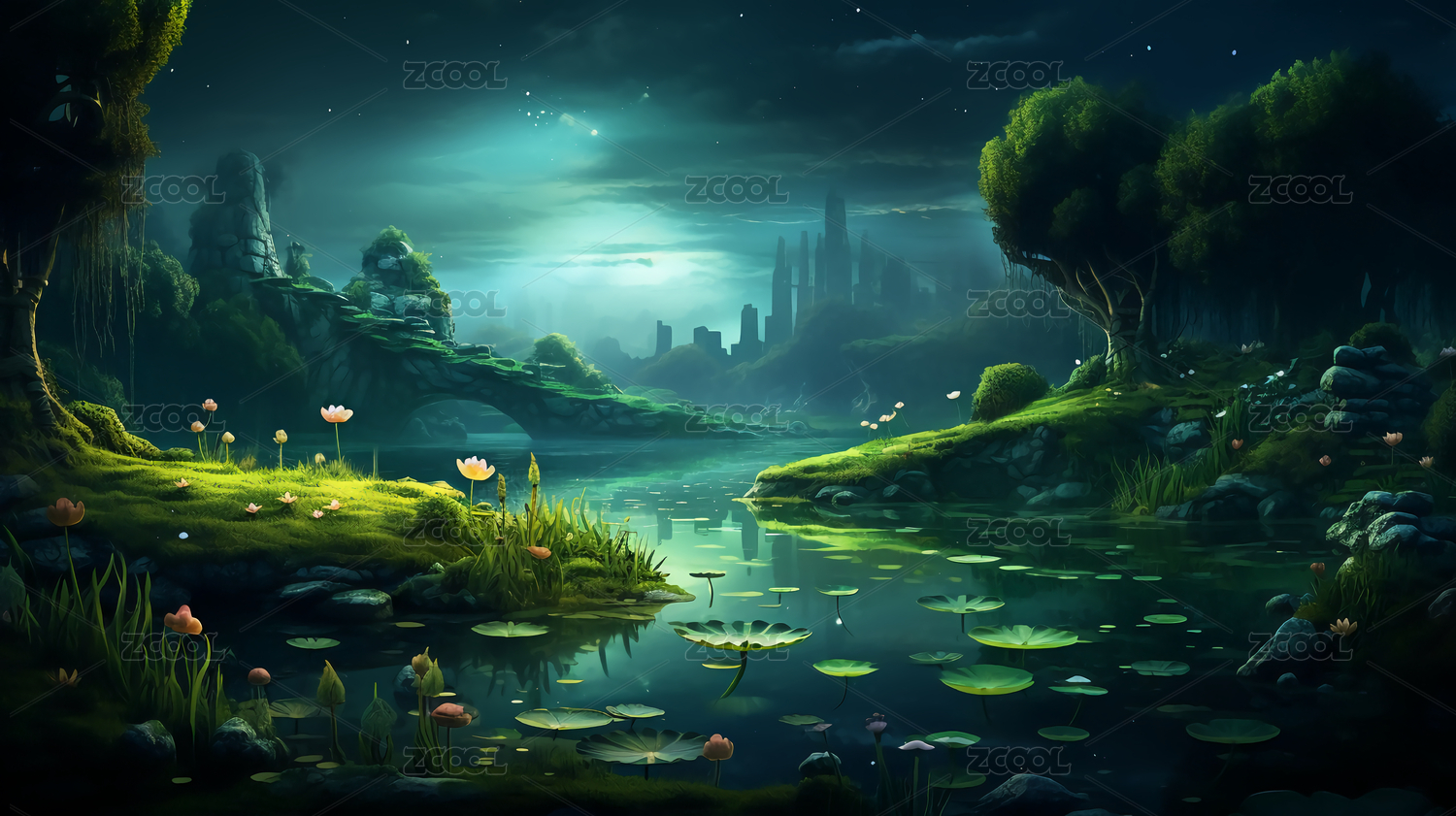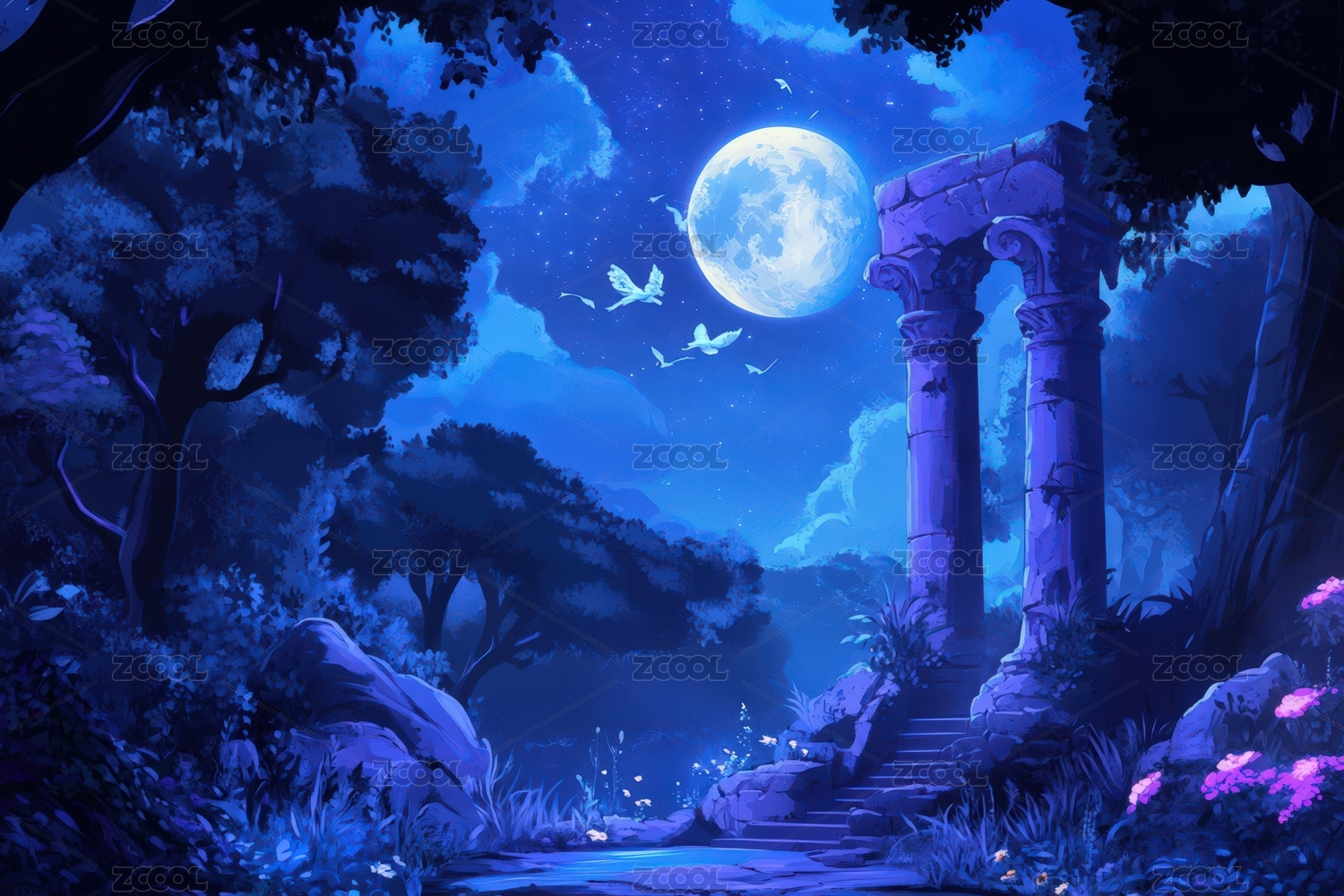 废墟, 月亮, 树木, 湖泊, 夜晚