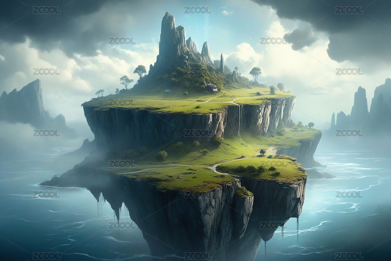悬浮岛屿上的古老树木在闪电中屹立不倒