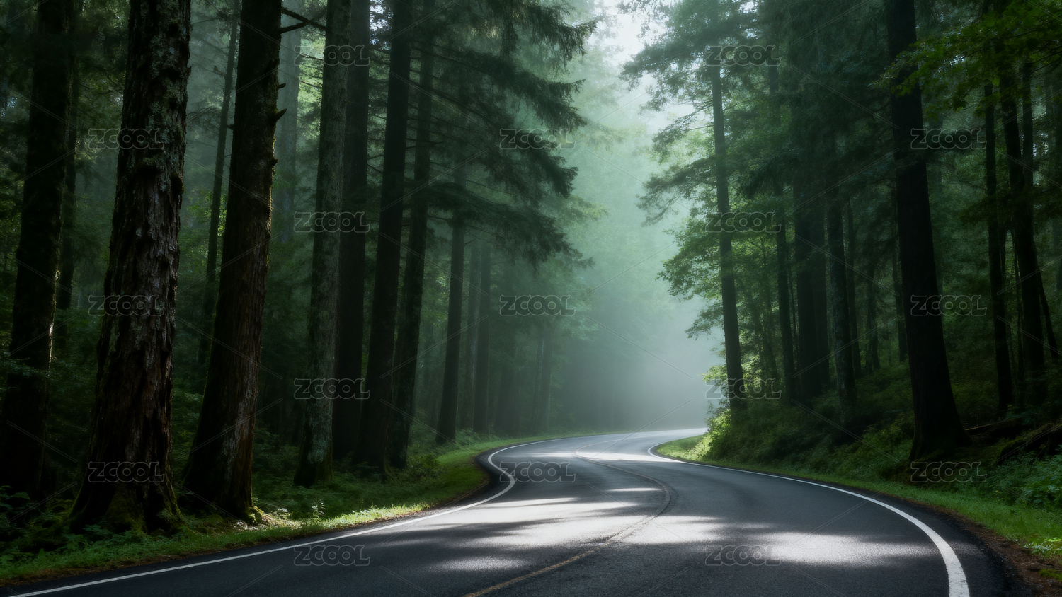 森林深处蜿蜒公路穿行雾中