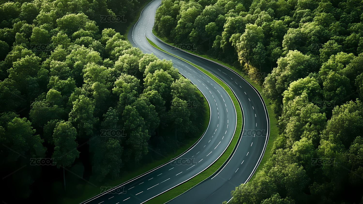 绿色草地森林与弯曲公路弯道路面背景