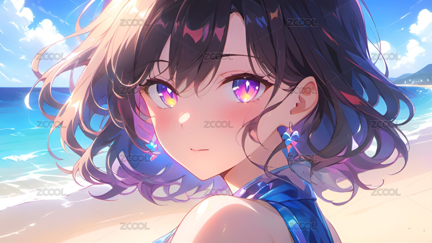 美女,人物,插画,海边,假期,白昼,海滩,海浪,二次元,梦幻