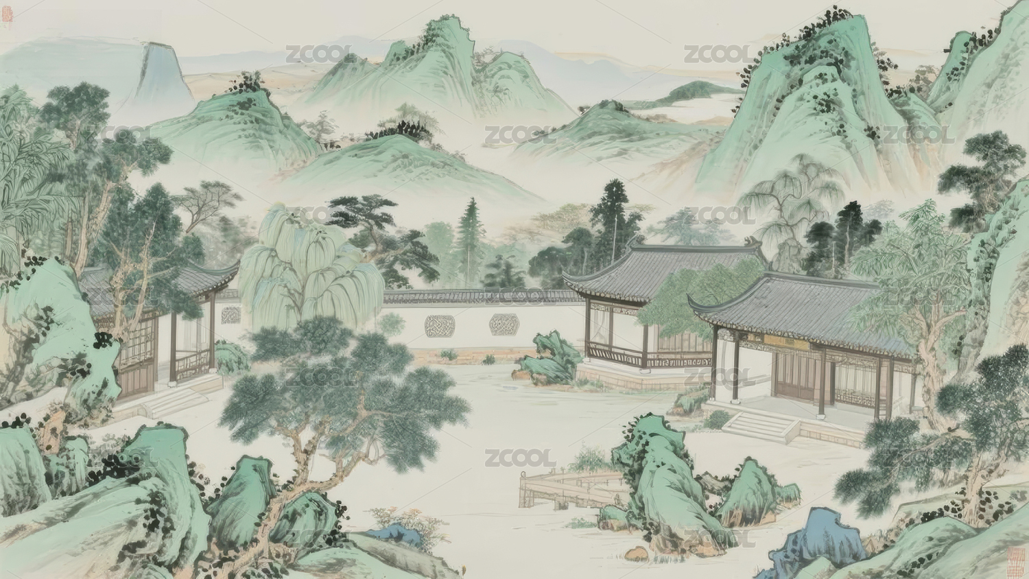 山水青绿古典园林场景