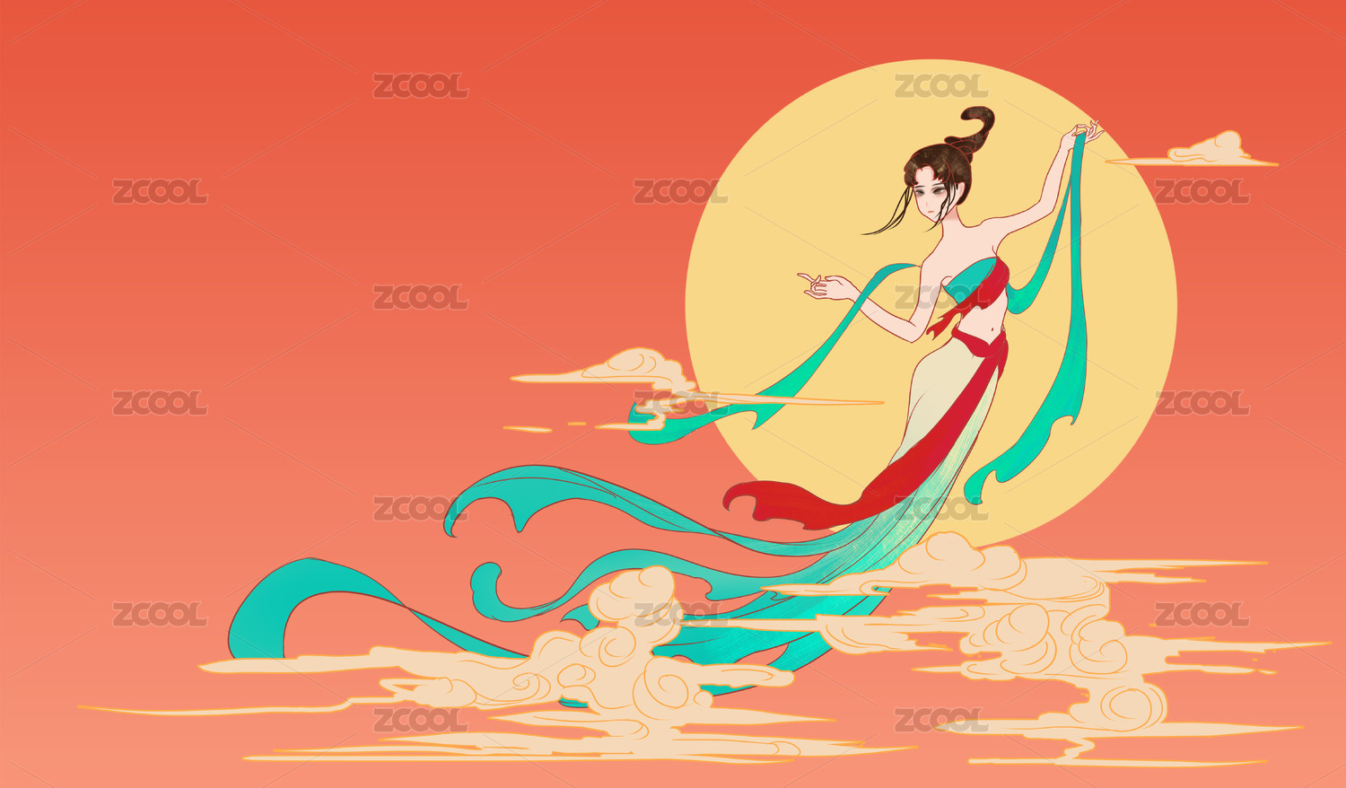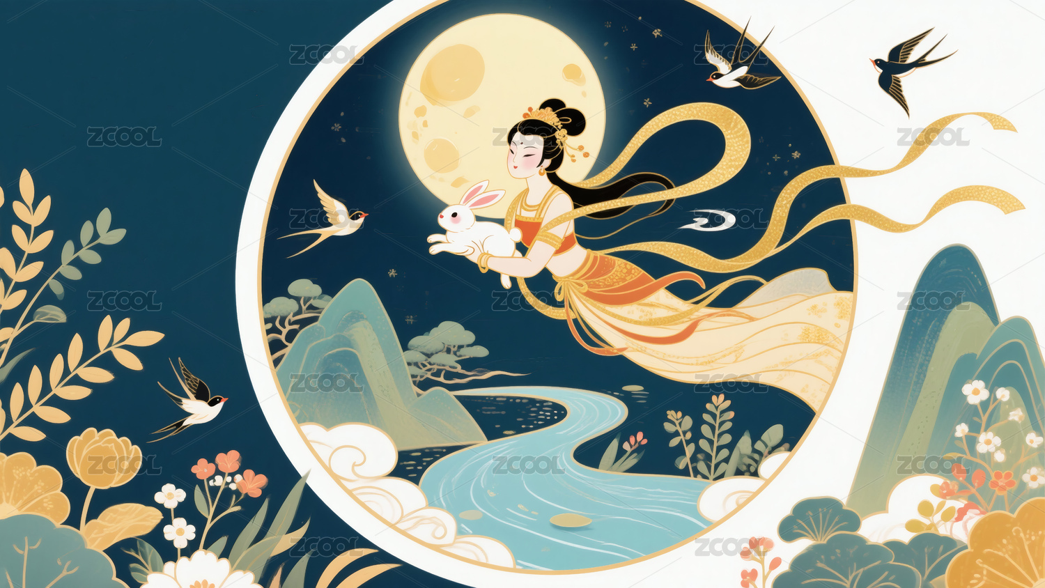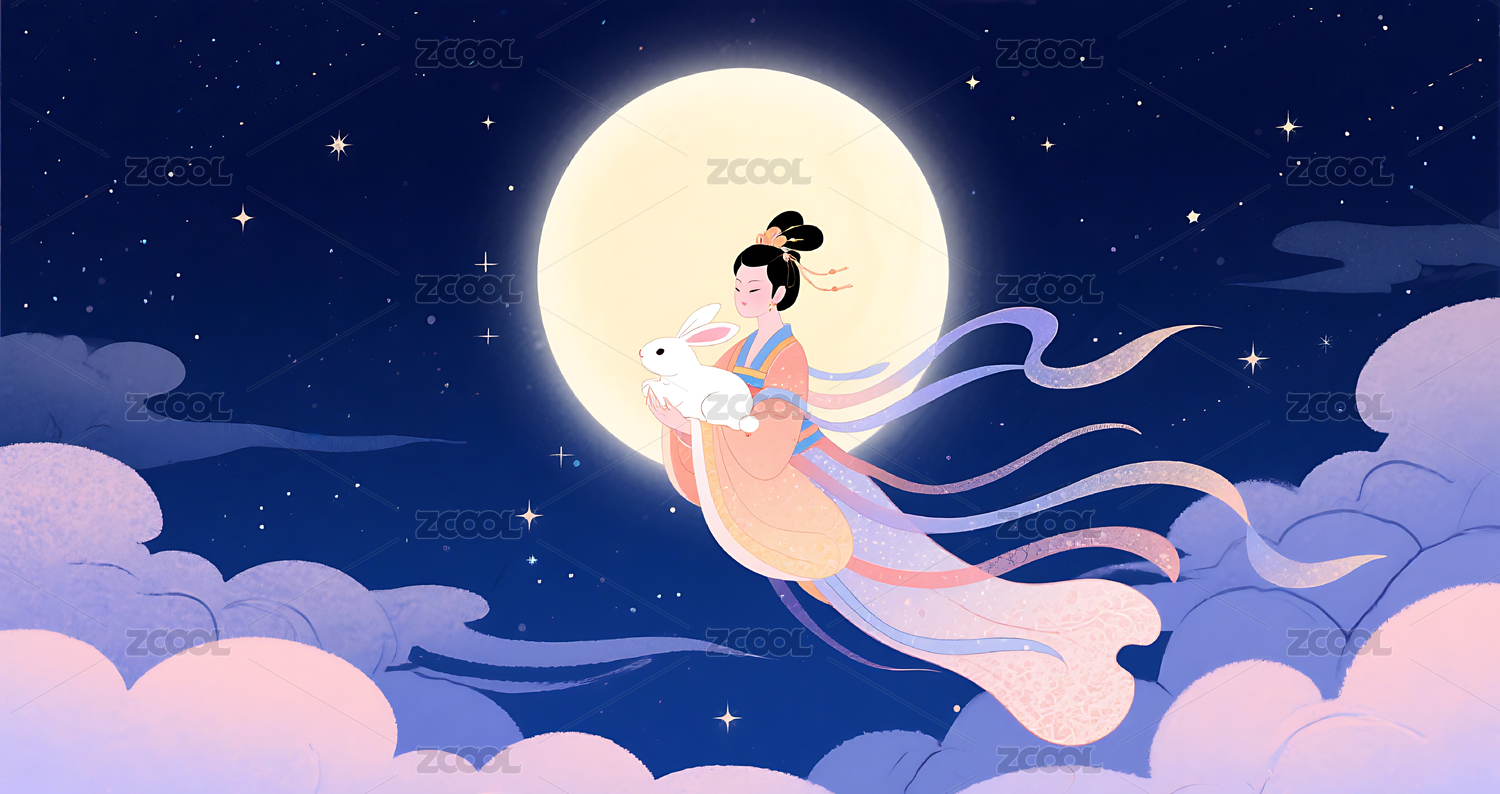 中秋节飞天仙女嫦娥奔月中国风插画背景