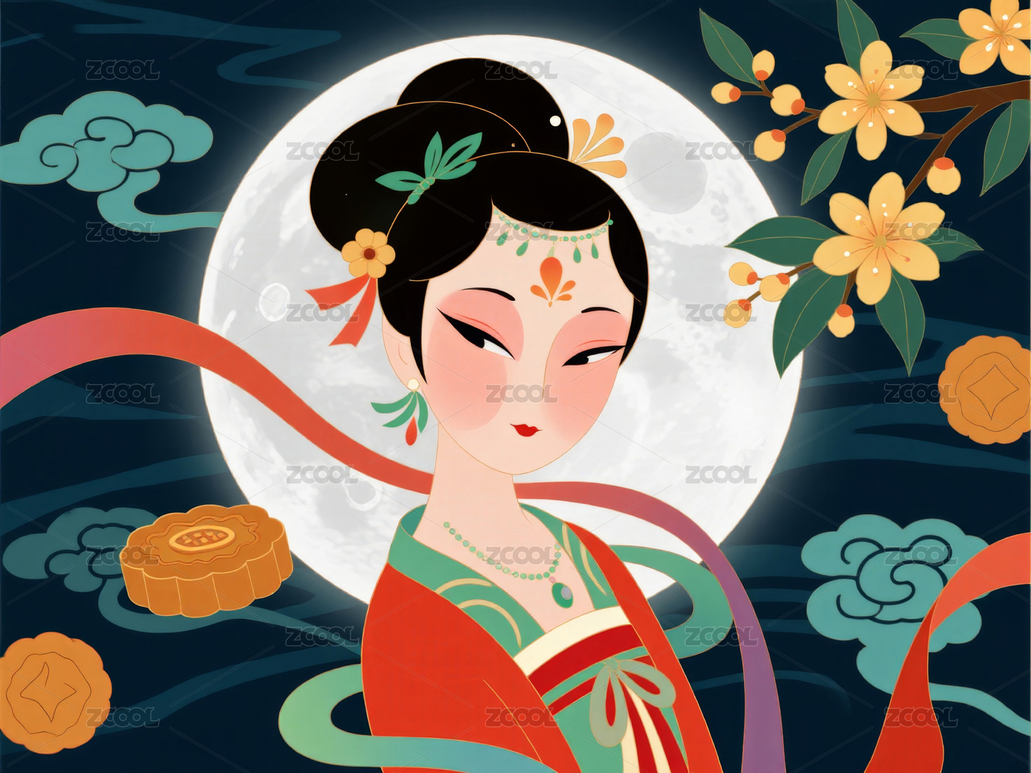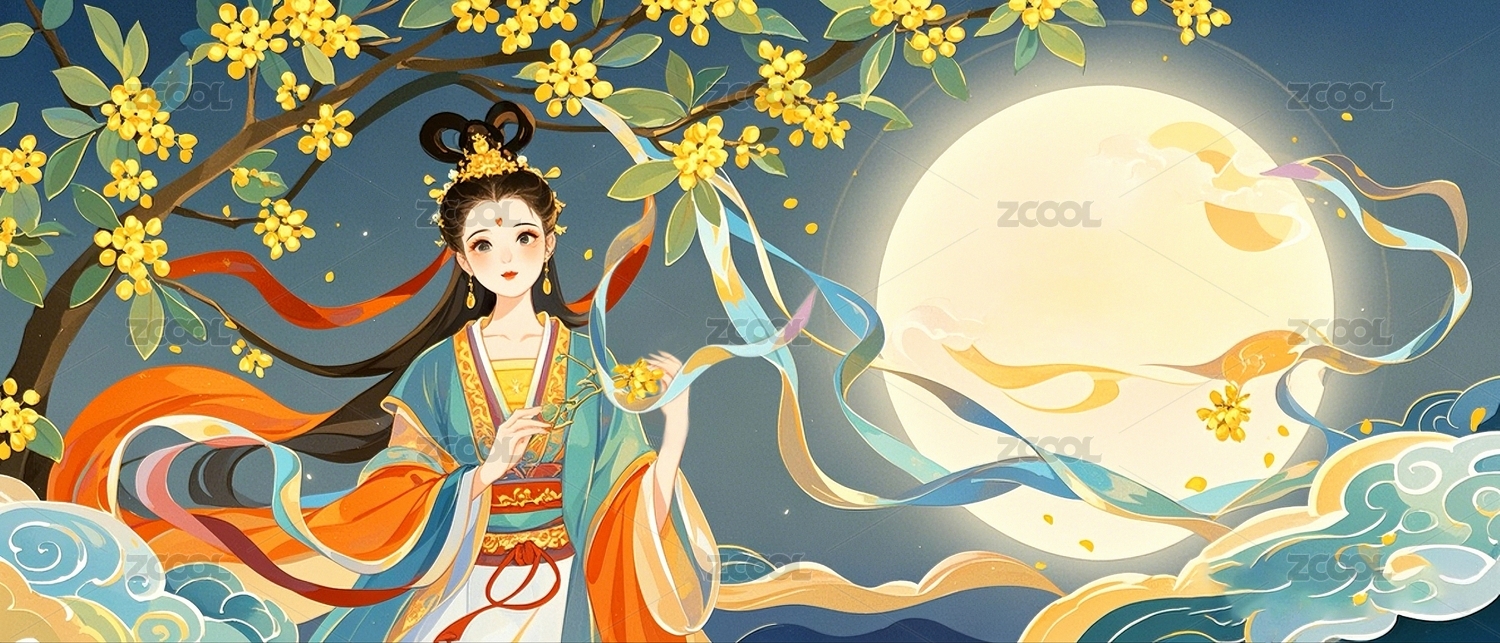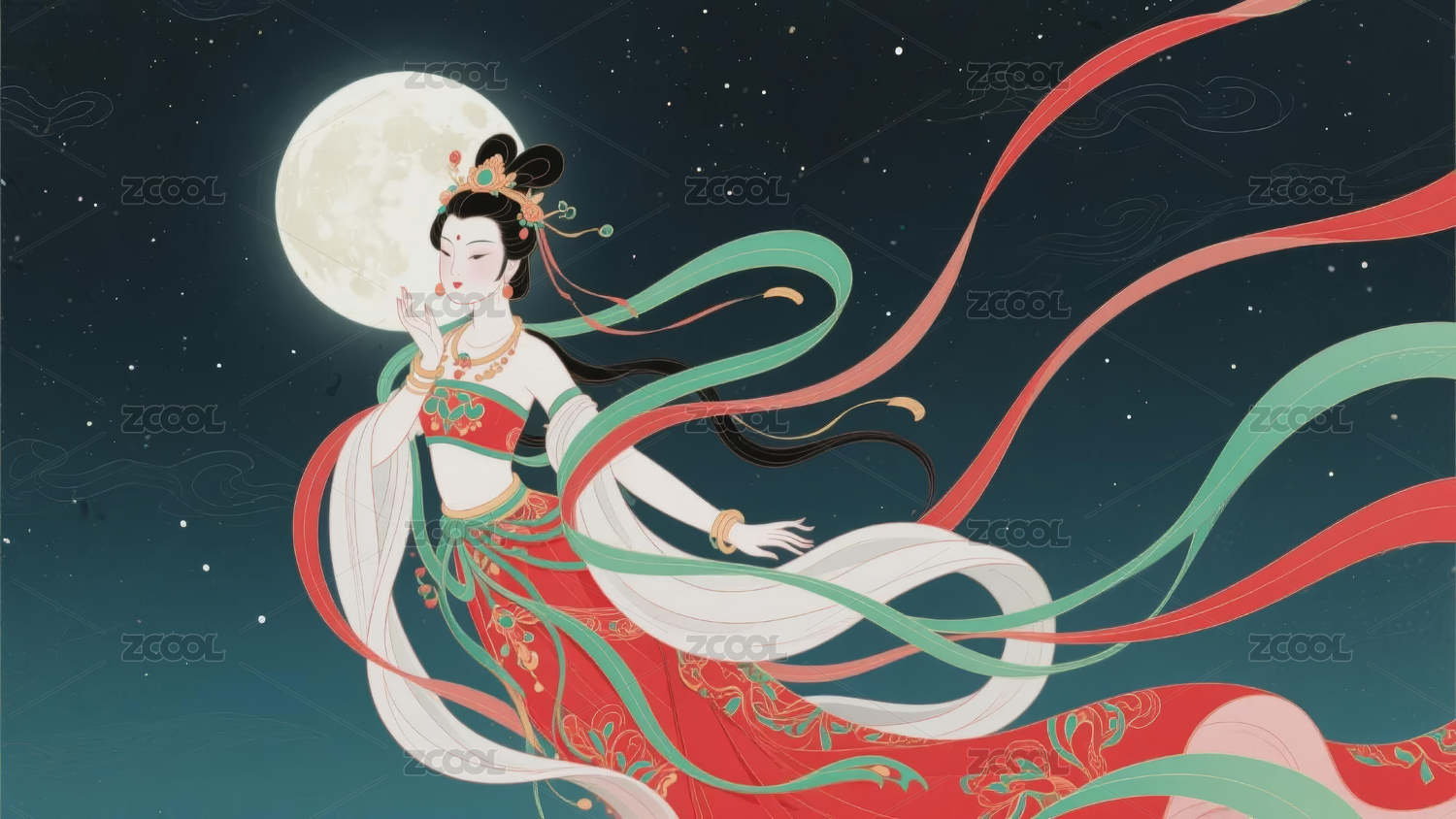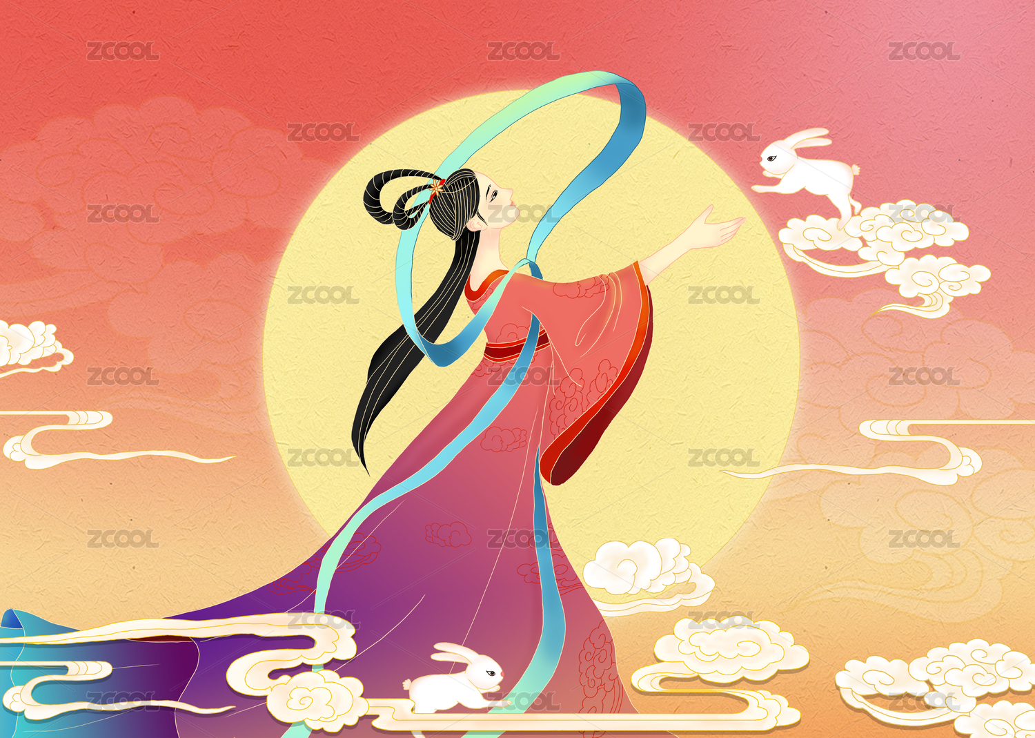 中秋节飞天仙女嫦娥奔月中国风插画背景
