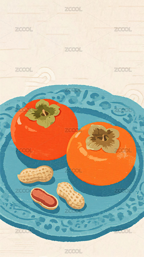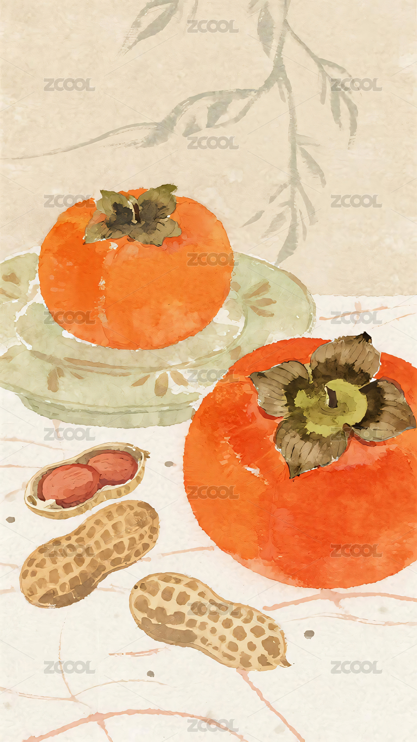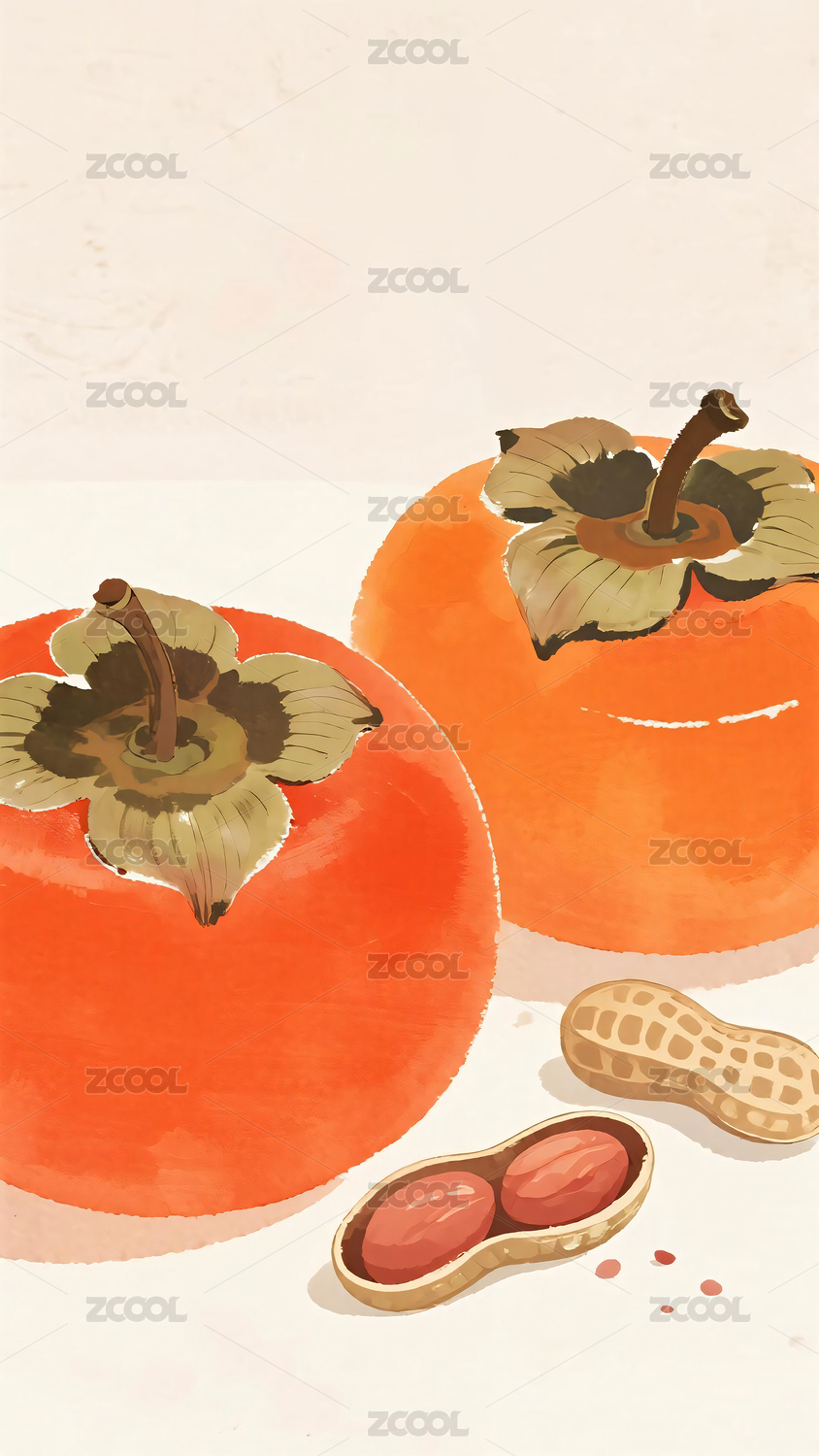 国风,柿子,花生,插画,萌趣,喜庆,治愈,新中式,吉祥,装饰画
