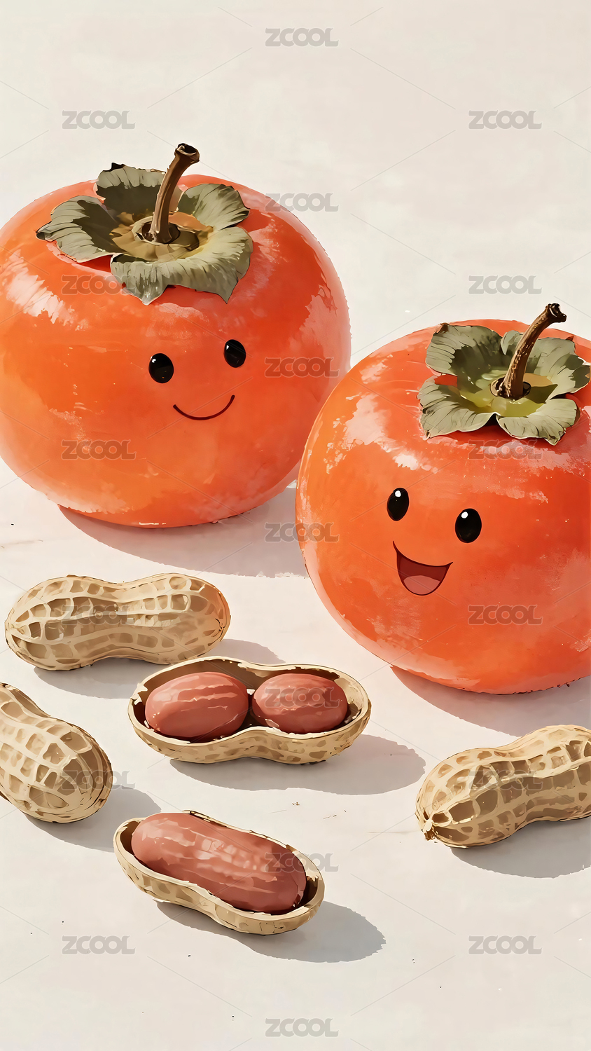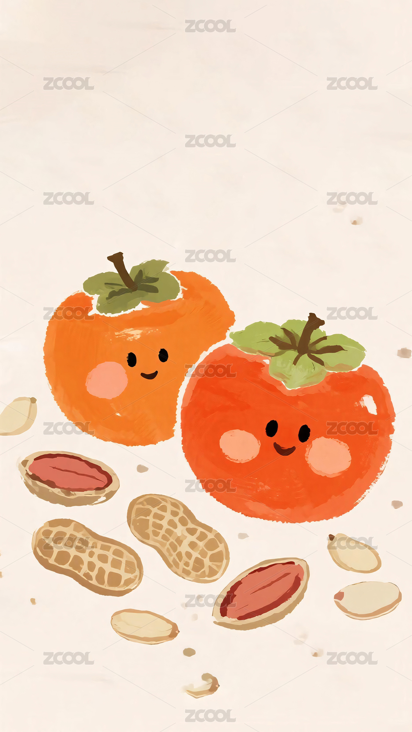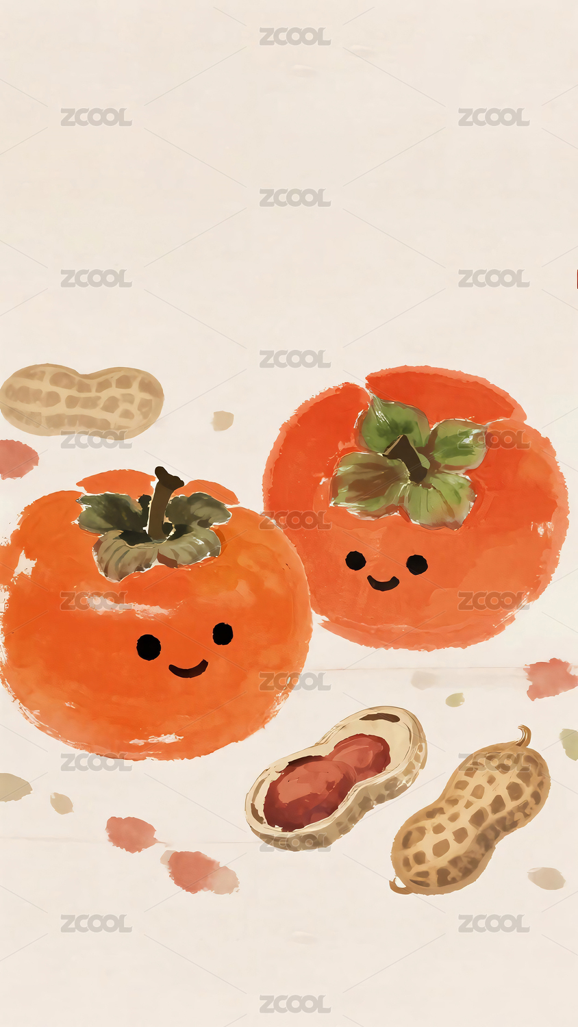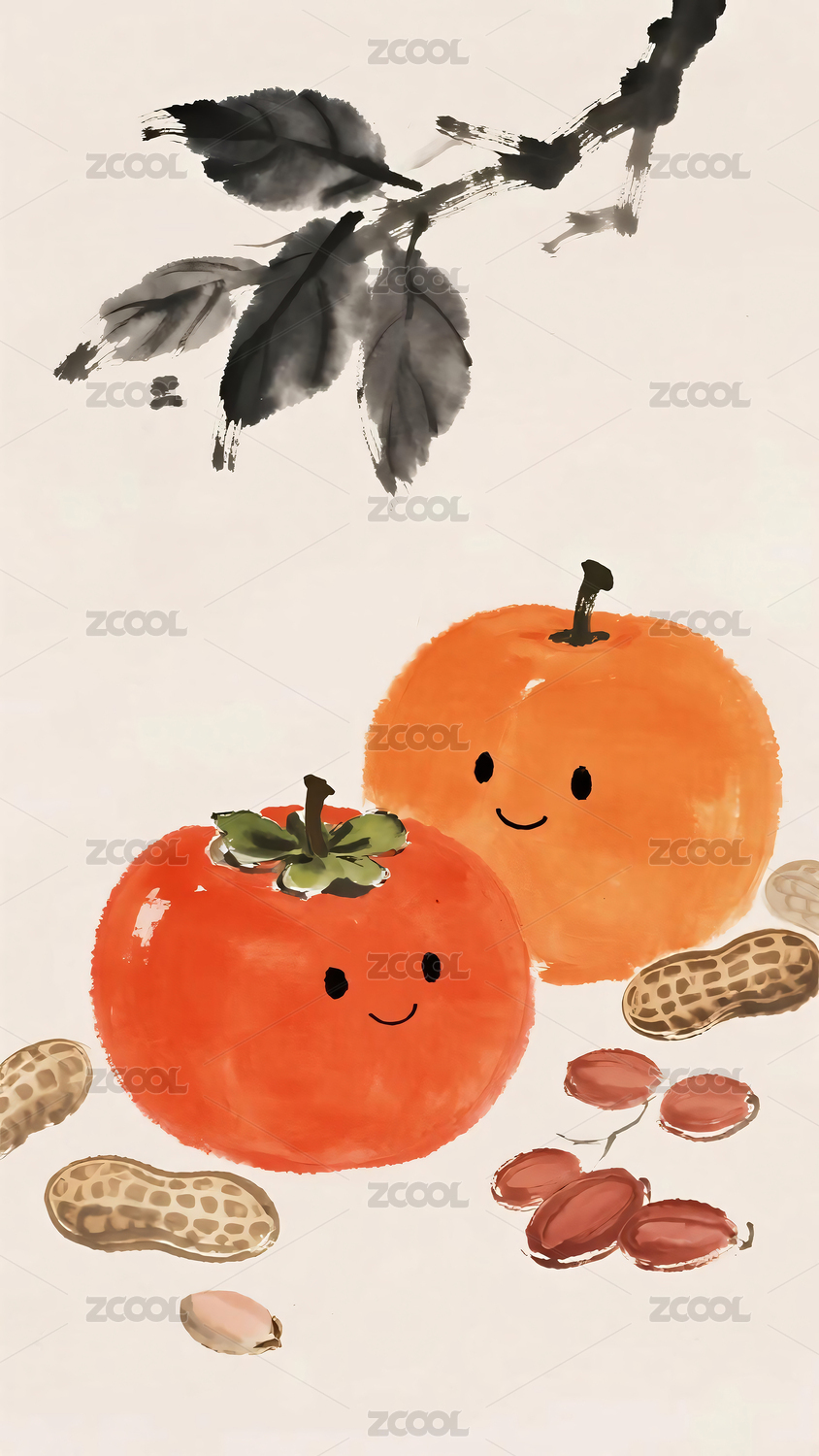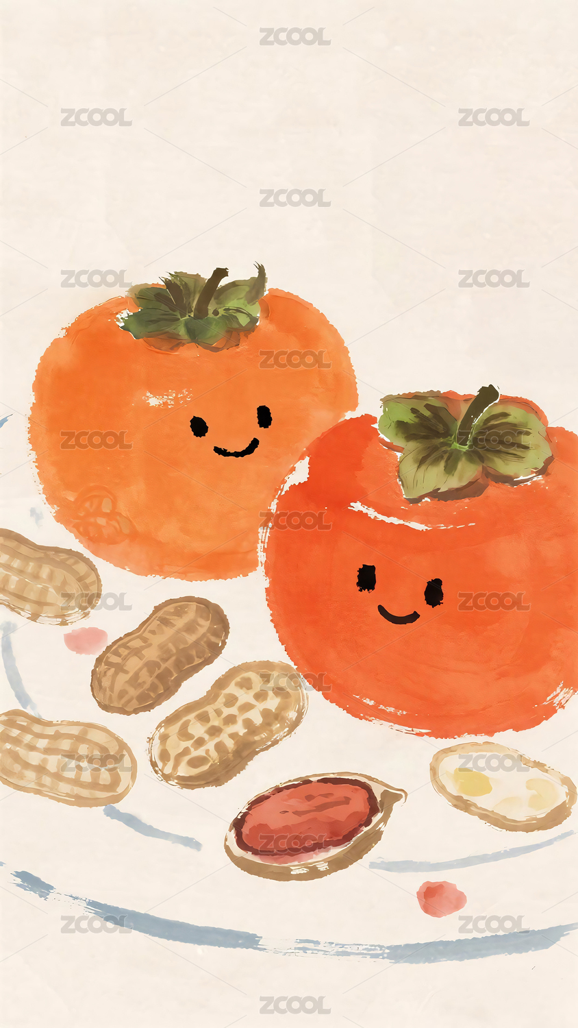 国风,柿子,花生,插画,萌趣,喜庆,治愈,新中式,吉祥,装饰画