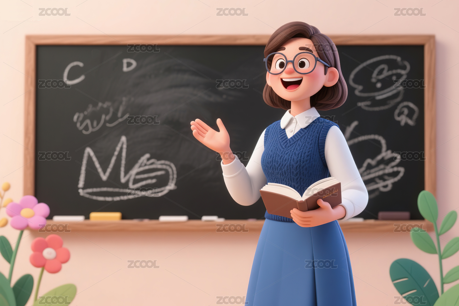 卡通老师在教室微笑