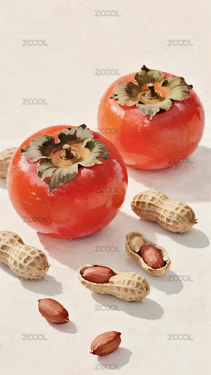 国风,柿子,花生,插画,萌趣,喜庆,治愈,新中式,吉祥,装饰画