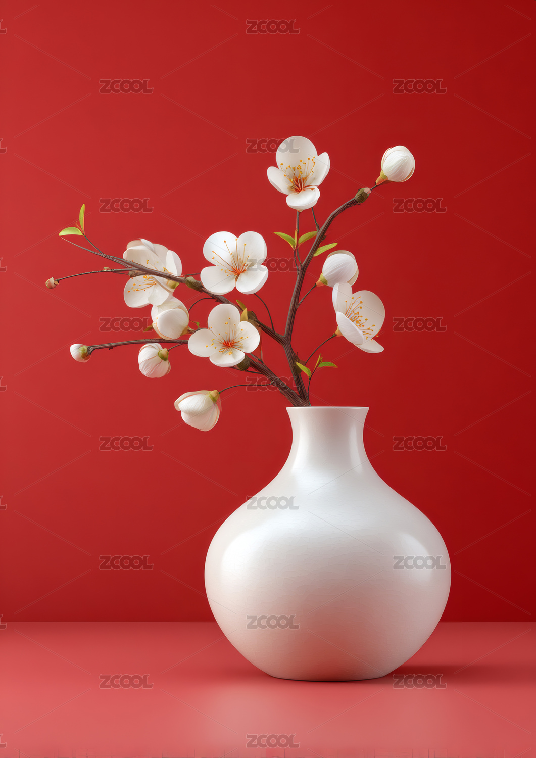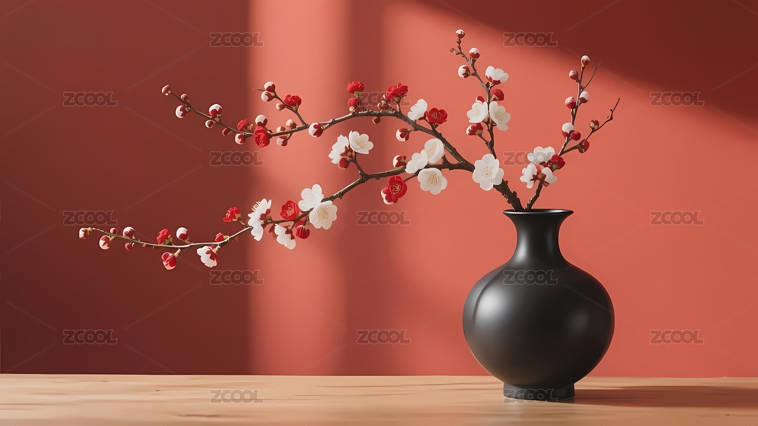 红色花瓶里插着几支梅花