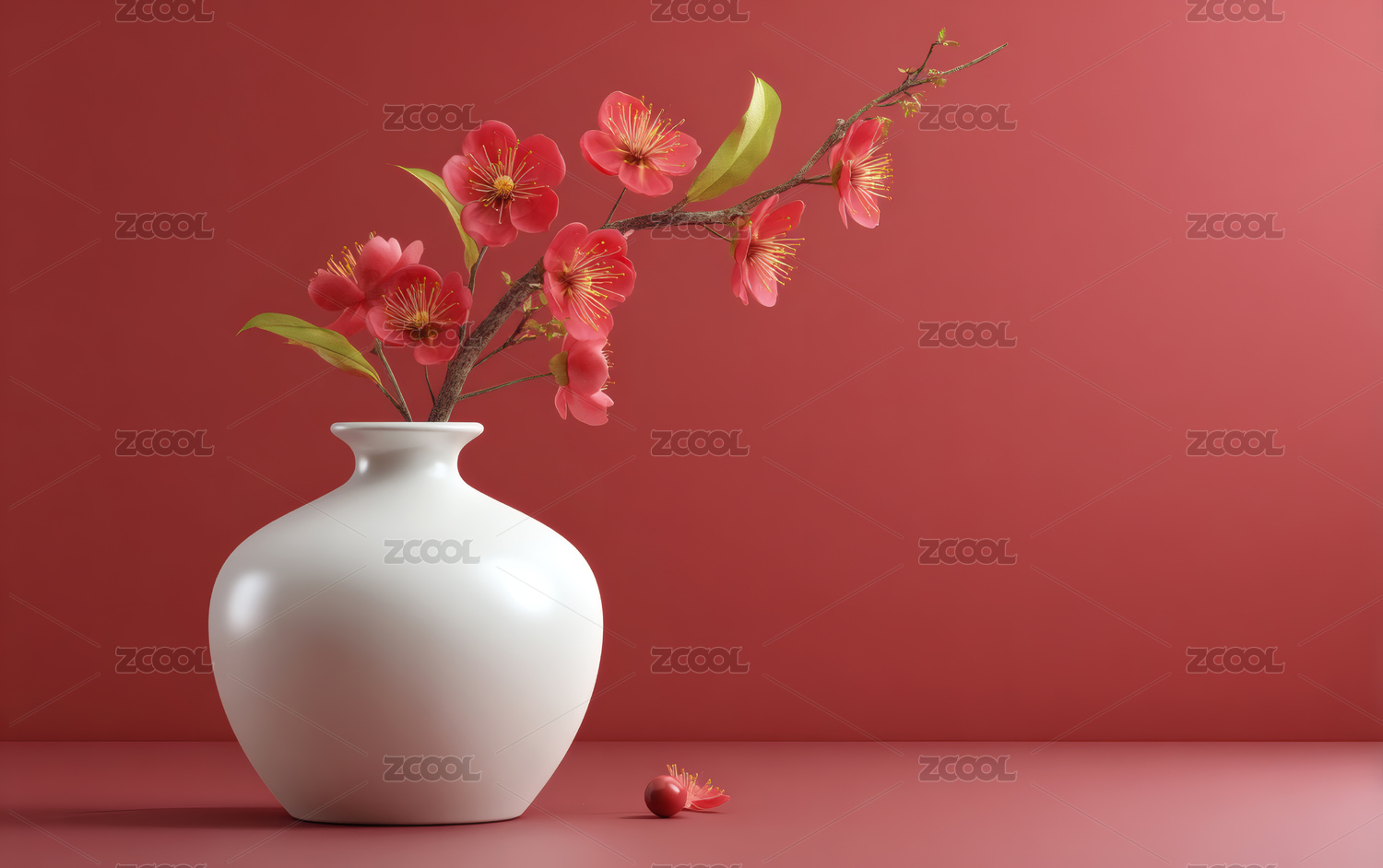 红底白花红果枝,红色花瓶插放