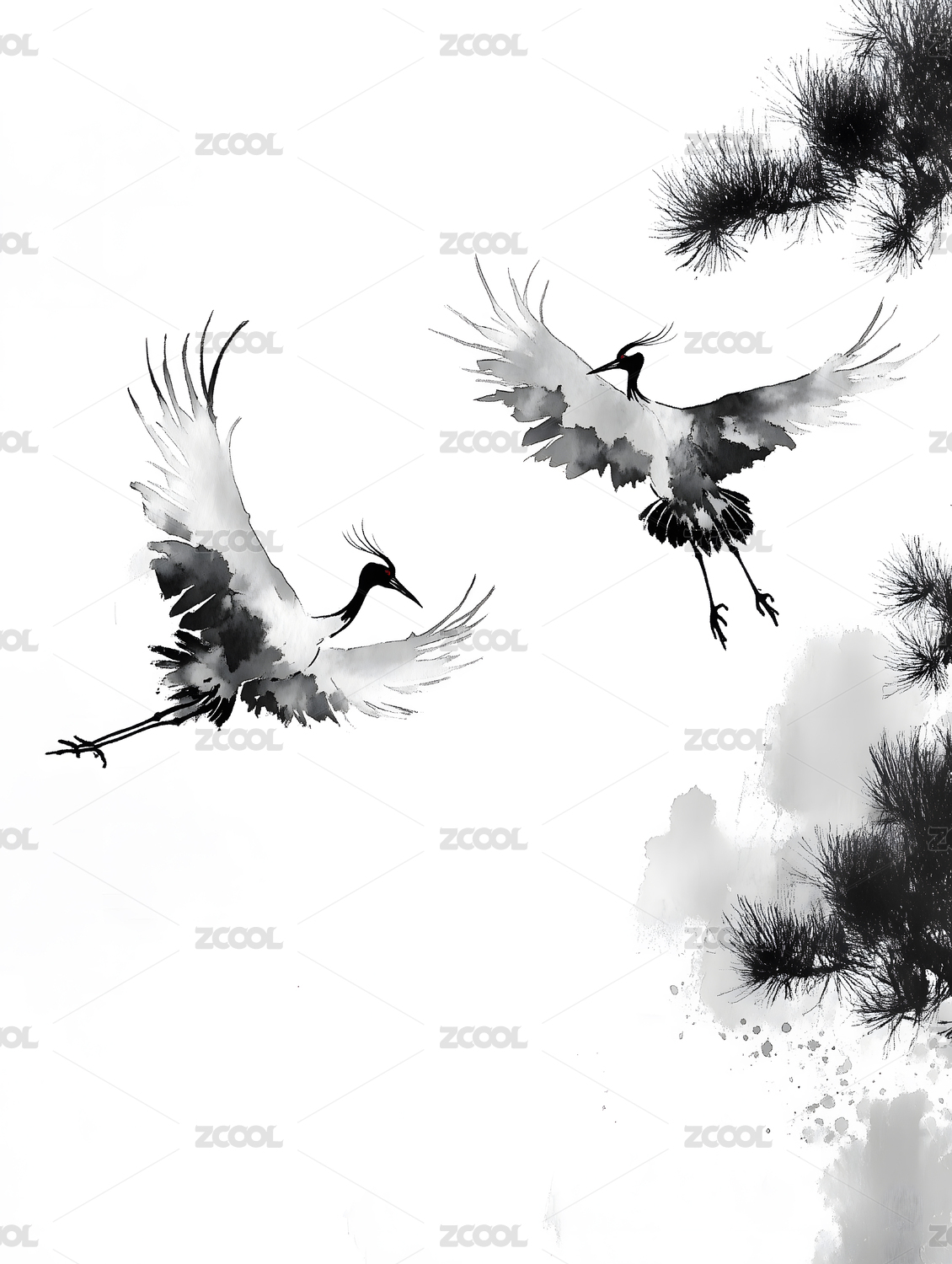 水墨风松树与仙鹤